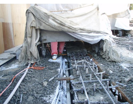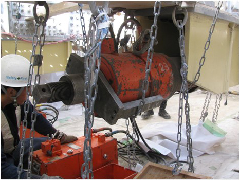 ケーブル定着体の設置(左)/外ケーブル緊張作業(右)