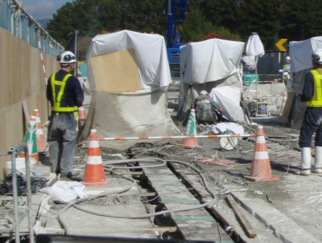 外ケーブルと鋼部材を用いた床版を抵抗断面として考慮しない主桁補強は、対面通行規制前に桁下に足場を設置してブラケットの設置・ケーブルの仮配置(緊張導入はしない)・補強部材の仮留めまでを行っておく。プレストレス導入および本留めは桁上の既設床版を全撤去して荷重がフリー状態になった後で施工する。
