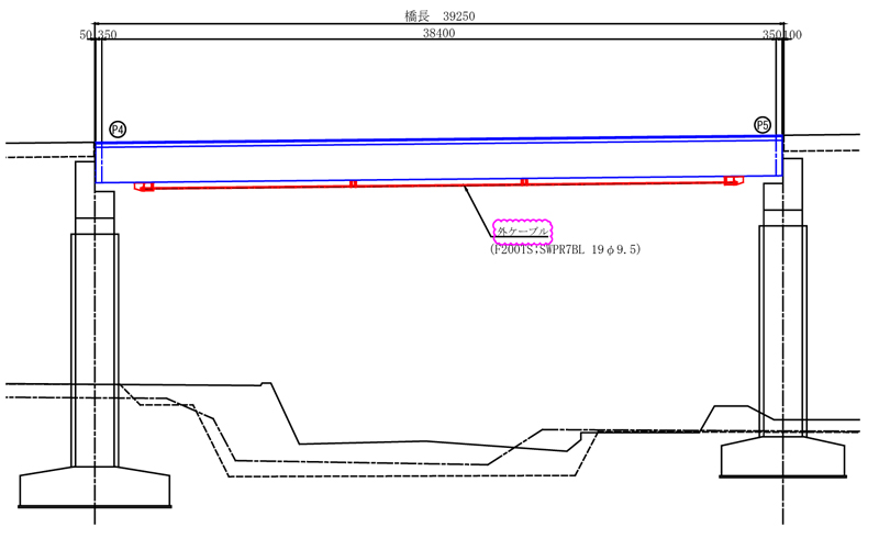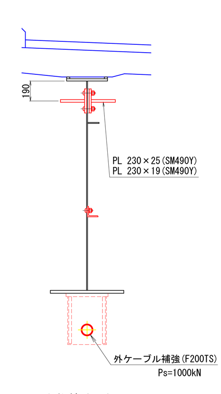 そのため、詳細設計(IHIインフラ建設)では、集中工事期間の延長を回避できる方法を検討した。具体的には、補強に必要な鋼部材量をできるだけ少なく、断面を小さくするため、外ケーブルを用いてプレストレスを導入し、既設主桁に作用する死荷重応力を低減させ、不足する分だけ補強部材を取り付けることにした。ただし、外ケーブル緊張(エスイー外ケーブルF200TS、有効緊張力約1000kN/本、主桁1本あたり1ケーブルを配置)からプレキャスト床版架設までの施工時に、一部の断面(両側桁長の1/4支点付近、通常は上側が圧縮、下側が引張状態となる箇所)が全圧縮となり、最悪の場合座屈することも考えられることから、施工時仮設対傾構に加えてウェブ(下フランジからおよそ全桁高の1/4高さのポイント)にL型の水平補剛材を補強した。この水平補剛材はプレストレス導入時からプレキャスト床版架設までの期間の足りない断面剛性を補強するためのもので、本補強完了後は特に必要ないが、塗装して残置する方針。