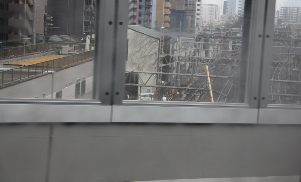 透明遮音板から跨いでいる線路が見える