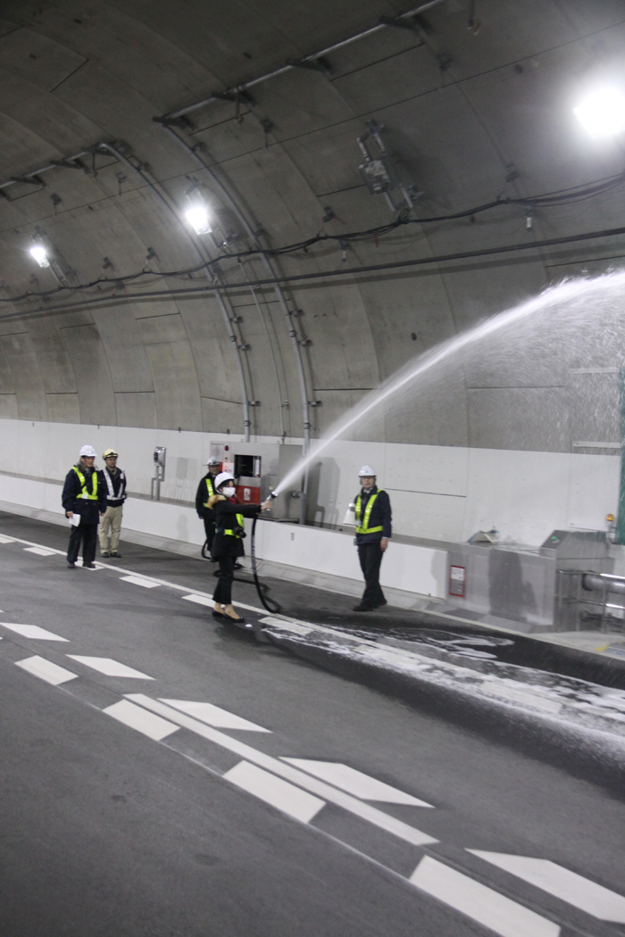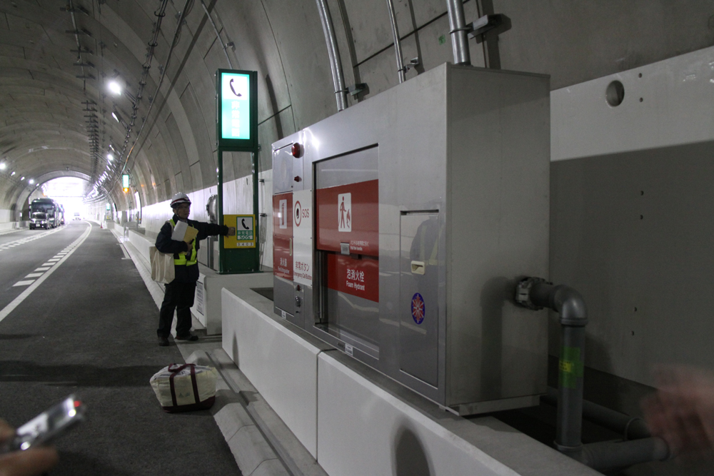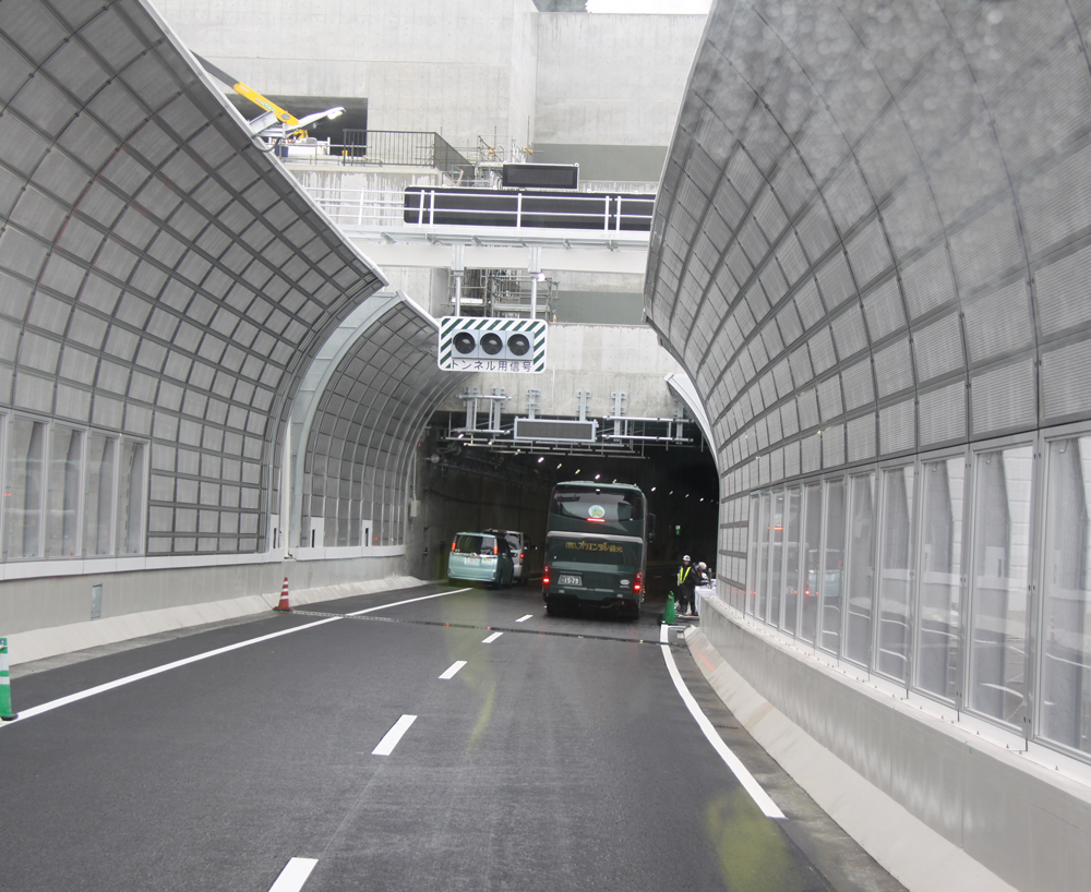 同トンネルは北線全延長8.2kmのうち、7割の5.9kmを占める。そのため様々な防災設備を設けて安全に努めている。トンネル上側には火災検知装置や検知した危険情報を伝えるための放送設備(約200mごとに設置)、延焼の拡大を防止するための噴霧機(1㎡当たり毎分6ℓの水を霧雨状に散布)があり、側面には100mごとに非常電話、ドライバーが泡状の消火剤を散布する消火設備や避難のため、床版下の避難用通路に逃げるためのすべり台設備がある。