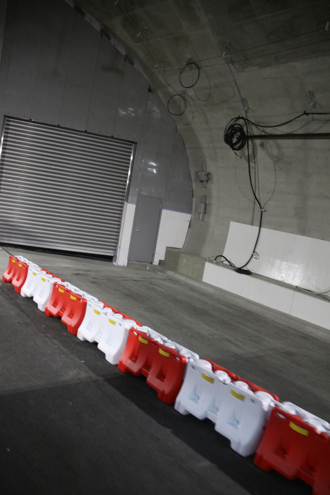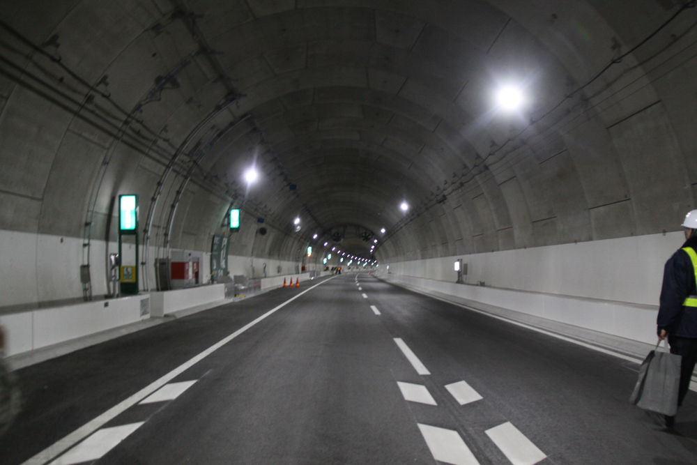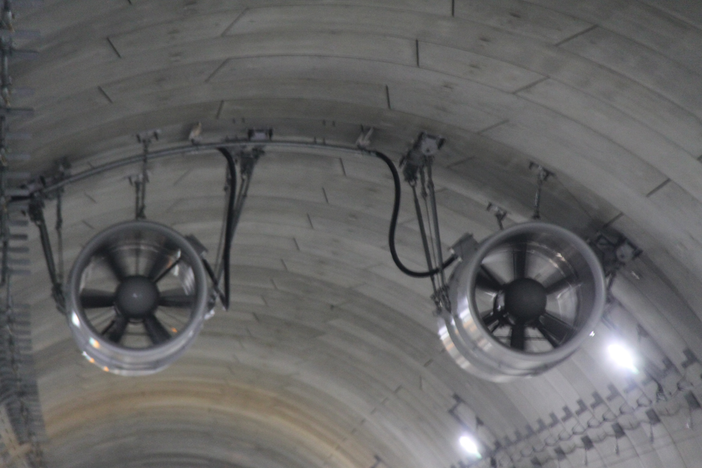 また、トンネルの換気は基本的に交通車両を利用して行う縦流換気方式を採用した。火災発生時には天井についているジェットファンを利用して煙の拡散を防ぐように制御する。