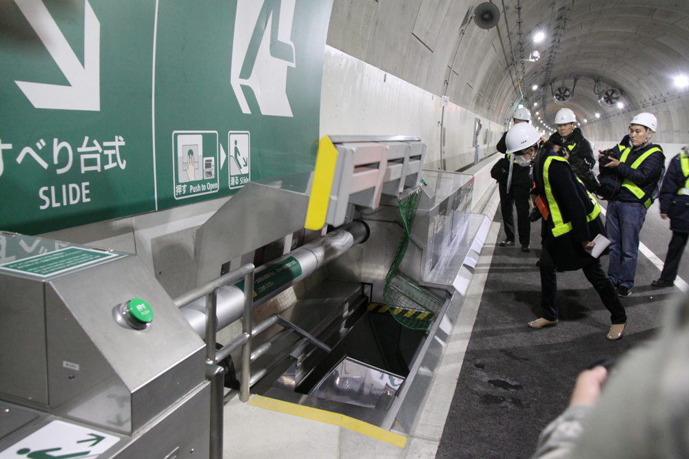滑り台設備は約250m毎(両坑口付近の勾配が大きい個所は設置間隔を狭めている)、合計76箇所に設置している。同設備は跳ねあげ扉方式で、600kgの錘で開く仕組みになっている。電動ではないため、停電等により非常時に動かない……といったことは生じない。