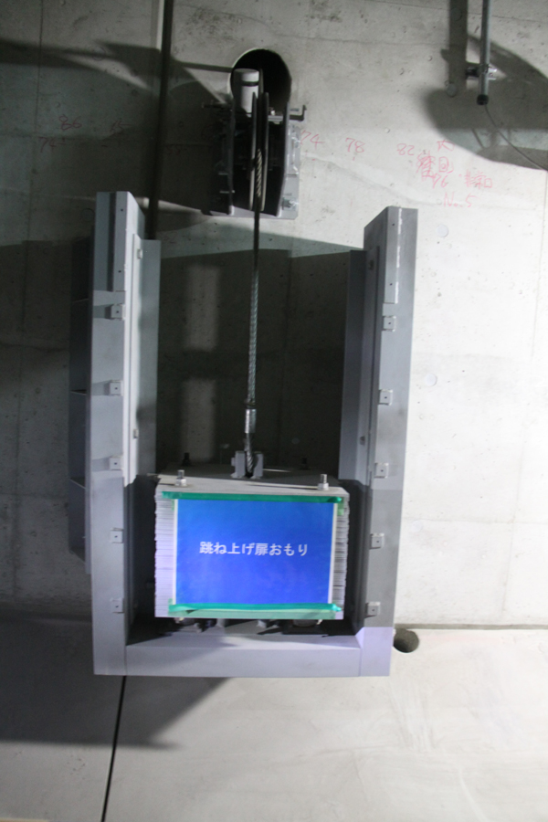 避難用すべり台は緑色のボタンを押すと跳ね上げて開く/600kgの錘で開く。電動ではない