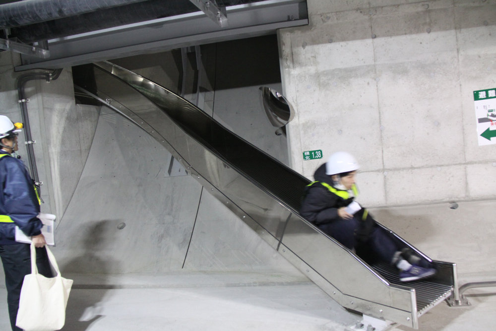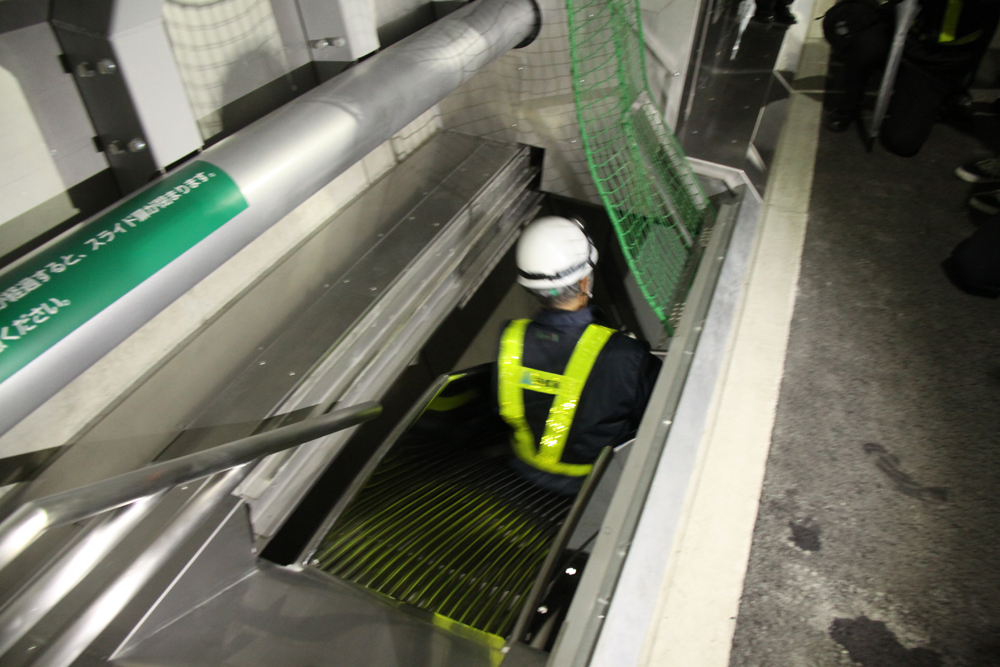 3mのすべり台を滑って床版下の避難用通路に降りる