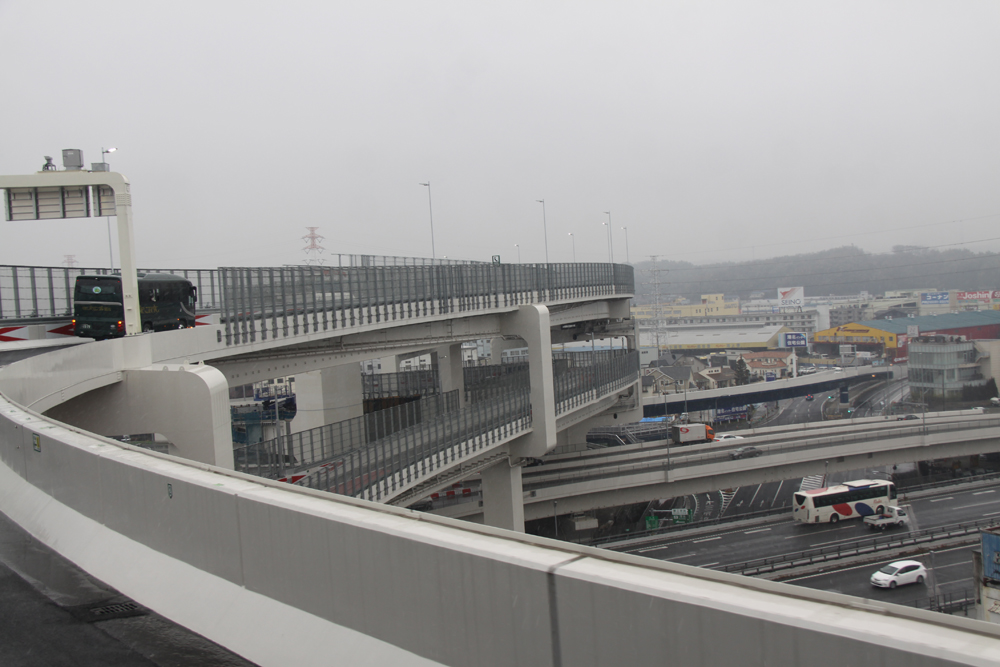 輻輳する桁(一番右から第三京浜→北線、一般道→第三京浜、北線→第三京浜、将来のランプ)