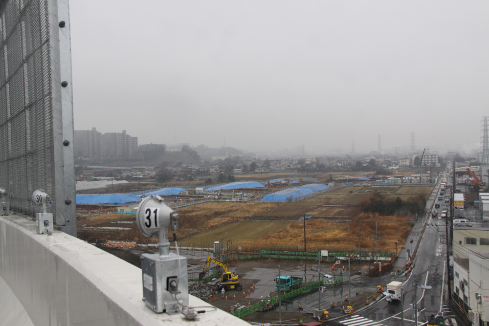 北線と北西線がリンクする部分(右側の橋脚方向へ桁が延伸していく)/青いシート部分が橋脚位置
