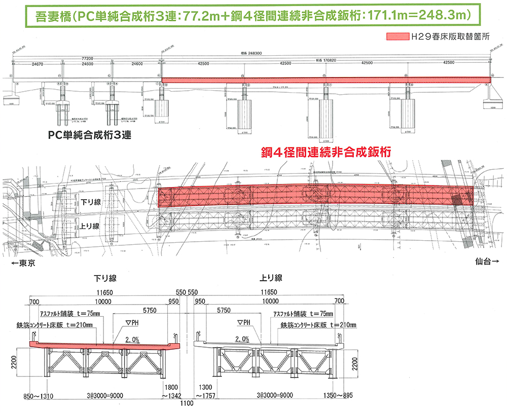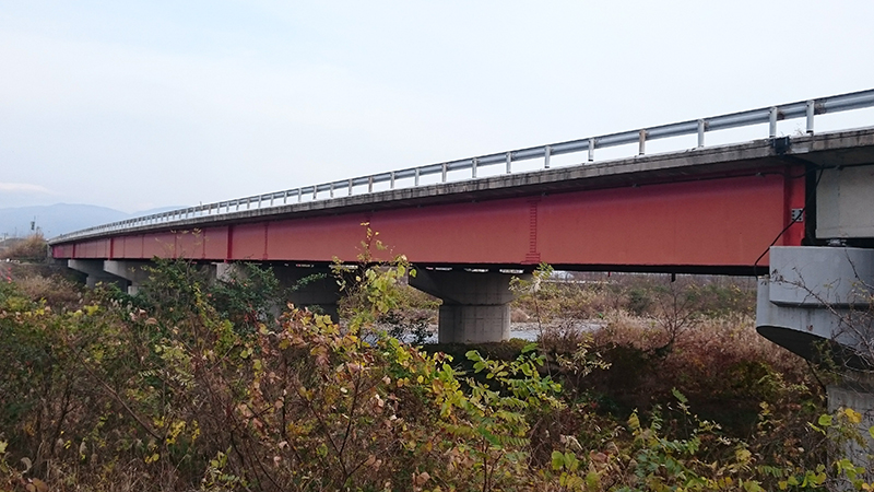 吾妻橋は、東北道福島西IC~福島飯坂IC間の一級河川松川を渡河する橋梁で、昭和50年に供用され、建設後42年が経過している。橋長248.3m、有効幅員11mのPC単純合成桁3連+鋼4径間連続非合成鈑桁橋だが、今回は171.1mの鋼4径間連続非合成鈑桁橋が対象となる。