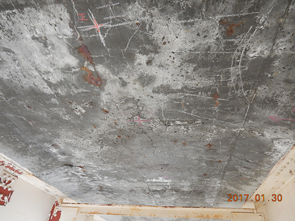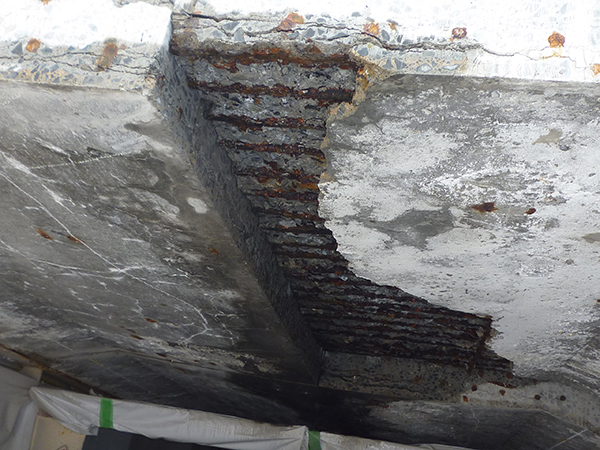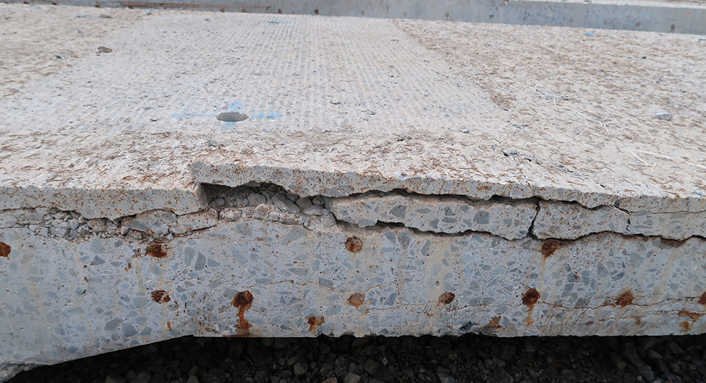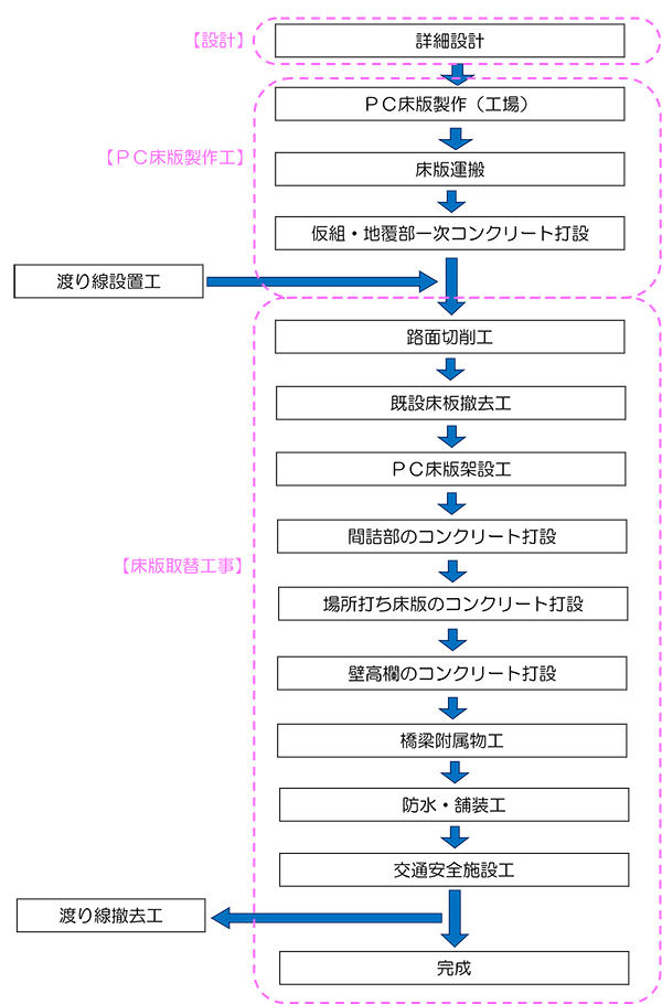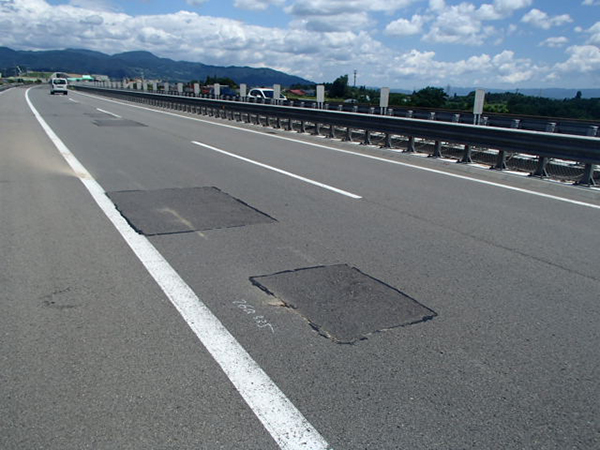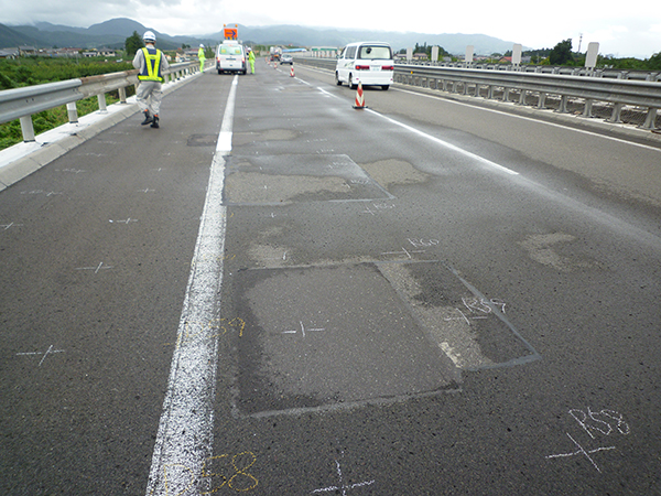 既設床版は、輪荷重によるコンクリートのひび割れや、冬期の凍結防止剤散布(平均で約2kg/㎡)の影響によるコンクリート内部への塩化物イオンの浸透により、断面欠損や表面の土砂化などのコンクリート床版の劣化や鉄筋に錆が発生し、舗装にもポットホールが生じている。とくに、走行車線は輪荷重が乗っている部分の浮きが激しく、追い越し車線は輪荷重よりも横断勾配により中央分離帯側に浮きが発生していた。