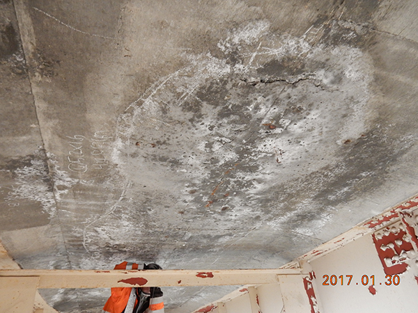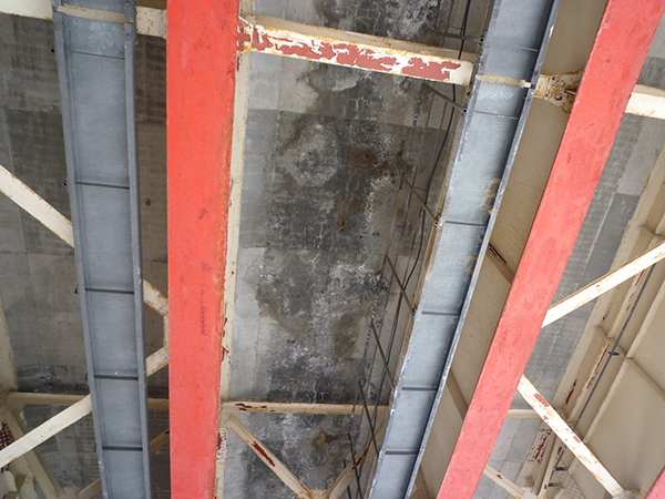 平成27年6月には劣化状況の調査を行ったが、コア採取5箇所中3箇所で24N/mm2以下の圧縮強度低下が見られ、塩化物イオン量も4箇所で1.2kg/m3の発錆限界値を超え、最高値は下り線P5付近の床版中央部(横断方向)で検出された7.3kg/m3となっていた。上面増厚時に、床版防水(現基準でのグレードⅠに相当)を施したが撤去した床版を見ると鉄筋付近や増厚界面付近に水平ひび割れが生じており、土砂化も散見される。