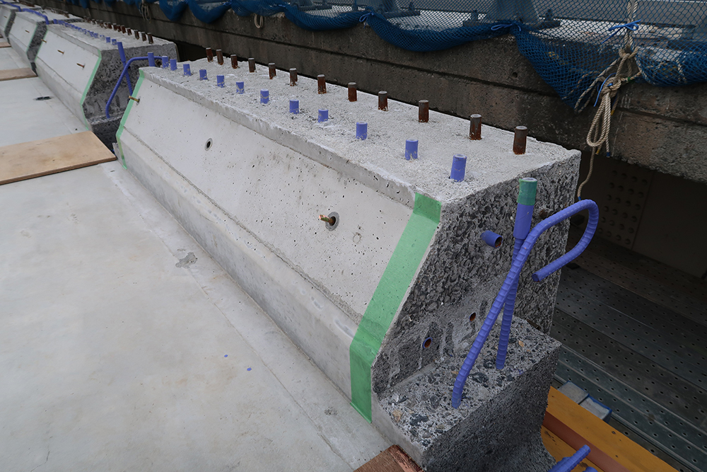 そうした点を踏まえて、プレキャストPC床版への全面取替えに際しては橋梁の全幅員をひとつのプレキャスト部材として製作。さらに現場付近の一次コンクリート施工ヤードで地覆の立ち上がり部、高さ約17cmを予め施工して現場に搬入することで、工期短縮を図るとともに、弱点となる床版と地覆の目地部の品質を向上させている。PC床版の埋込鉄筋及び間詰部の鉄筋についてはエポキシ樹脂塗装鉄筋、床版防水は高性能床版防水(グレードⅡ)を採用するなど耐久性向上に努めている。