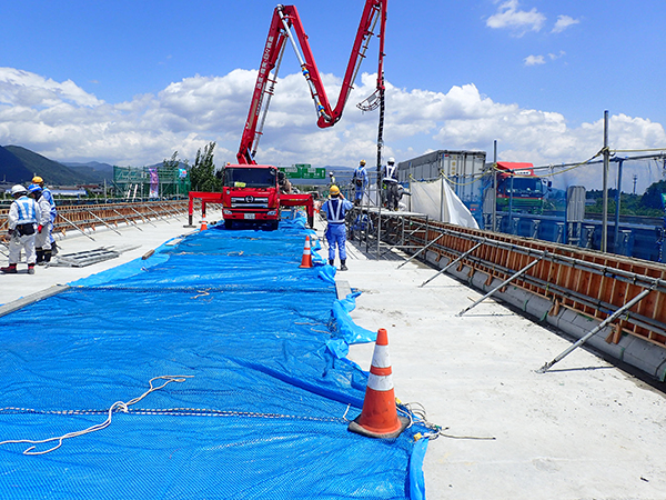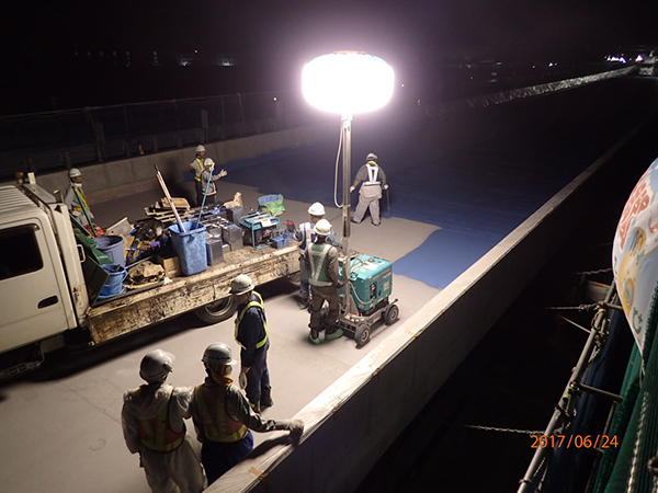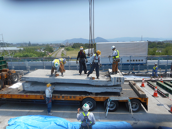 工期は5月22日から7月2日までの42日間だったが、下り線全面の床版取替えにより工事中は車線を上り線に集約し対面通行にする必要があるため、3月末からGW前にかけてガードレールの脱着、シールコンクリート打設の渡り線前捌き工事を実施した。5月22日から26日朝まで、安全対策のため仮設ガードレールの設置などを行い、車線切替えを実施。既設床版の撤去、PC床版の架設を29日から6月7日までの10日間で行い、高欄など橋梁付属物の設置、床版防水および舗装などを28日まで施工し、完了した後、車線切替えを行った。