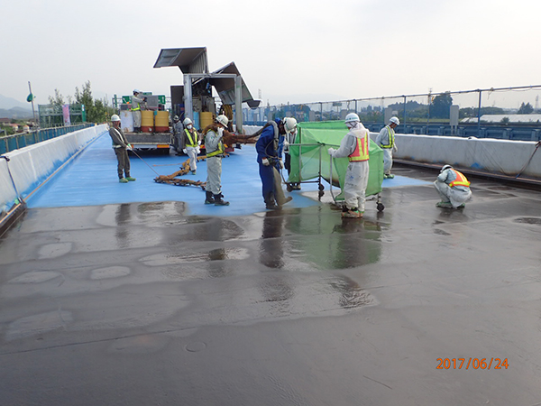 床版防水は、高性能床版防水工法(グレードⅡ)を採用し、ニチレキのHQハイブレンAU工法を用いた。