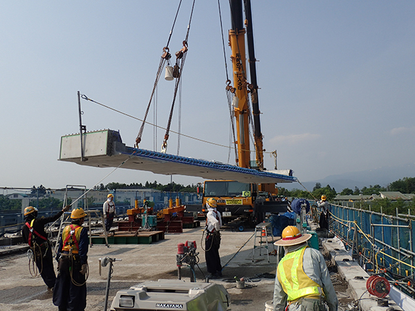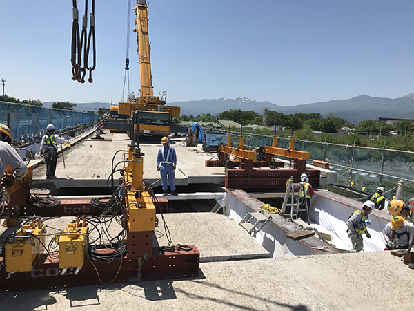 床版の撤去・架設は、P3(福島西IC側)からP6までを220tオールテーレンクレーンで、P6からA2(福島飯坂IC側)までを120tオールテーレンクレーンで施工する。床版撤去は総幅員11mを2分割して1ブロック(重量約9t)として施工。架設は総幅員11m×長さ2mを1パネル(重量約18t)として施工し、1日の架設量は、P3からP6側が7枚、P6からA2側が4枚で合計11枚となる。施工機械は、橋面上の2台のクレーンのほか、ストックヤードでの床版積込・積卸用120tクレーン1台、50tクレーン2台、床版運搬用25tトレーラー8台、撤去床版運搬用10tトラック3~4台となる。
