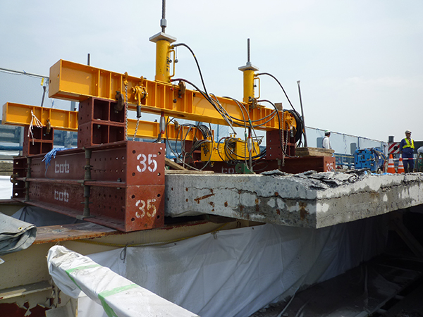 220tと120tクレーンで1日11枚の床版を撤去、架設