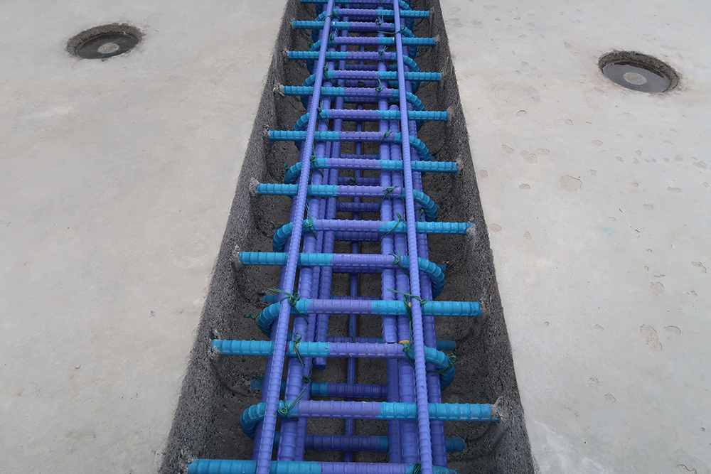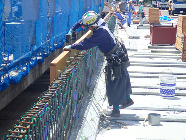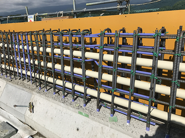 床版同士の継手部はループ鉄筋継手方式を採用している。床版内の鉄筋はすべて高付着型エポキシ系樹脂粉体塗装鉄筋「MK-エポザク」で、ループの曲がり部分と打継部分には防食のためにAGスプレーを塗布している。継手部の間詰めコンクリートの打設箇所は79カ所で、1カ所当たりの打設幅は平均36cmとなっている。PC床版と同じ50N/mm2の膨張剤入り早強コンクリートでの打設をしている。伸縮装置はP3側が鋼製フィンガー、A2側が製品ジョイントを採用した。