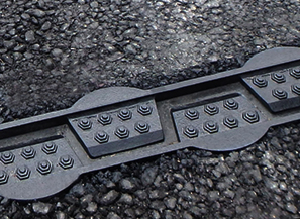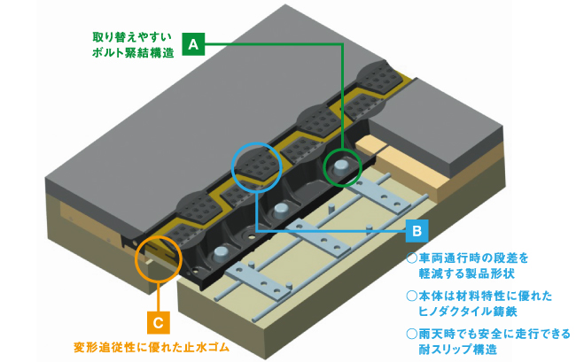 ヒノダクタイルジョイントαは、マンホールの鉄蓋で実績のあるFCDを用いた鋳鉄製伸縮装置。「FCDのマンホール鉄蓋は、大型車が多数通過する箇所に長期間設置していても、破損する事例は発生していない」(同社)表層には耐スリップ性を考慮したアンタイスリッピングデザイン(マンホール鉄蓋上の形状に似た3重の突起形状を有したもの(下写真)で濡れたアスファルトと同様の摩擦係数を有する)を採用している。ジョイント前後の現場打ちコンクリートにはデンカ製の無収縮モルタル(デンカ ハイプレタスコン TYPE-H)を使用しており、施工後の収縮クラックによる損傷を抑制できる。また、ジョイントは歯型形状の「歯」部分だけでなく、根本の歯茎に当たる半円形状部分も車両荷重の一部を受ける構造になっており、アスファルト舗装の沈下や轍掘れによる段差の影響を抑制できる。