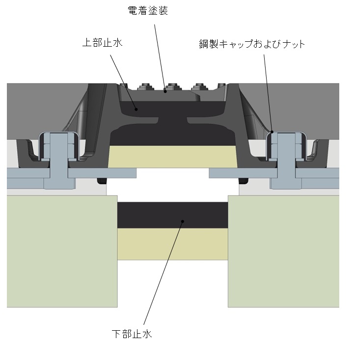 止水構造は上下2重止水構造となっている。特長は上部の構造で、突起を挟むようにゴムが設置されているため、雪や土砂などの踏抜荷重にも非常に強い耐力を有する。