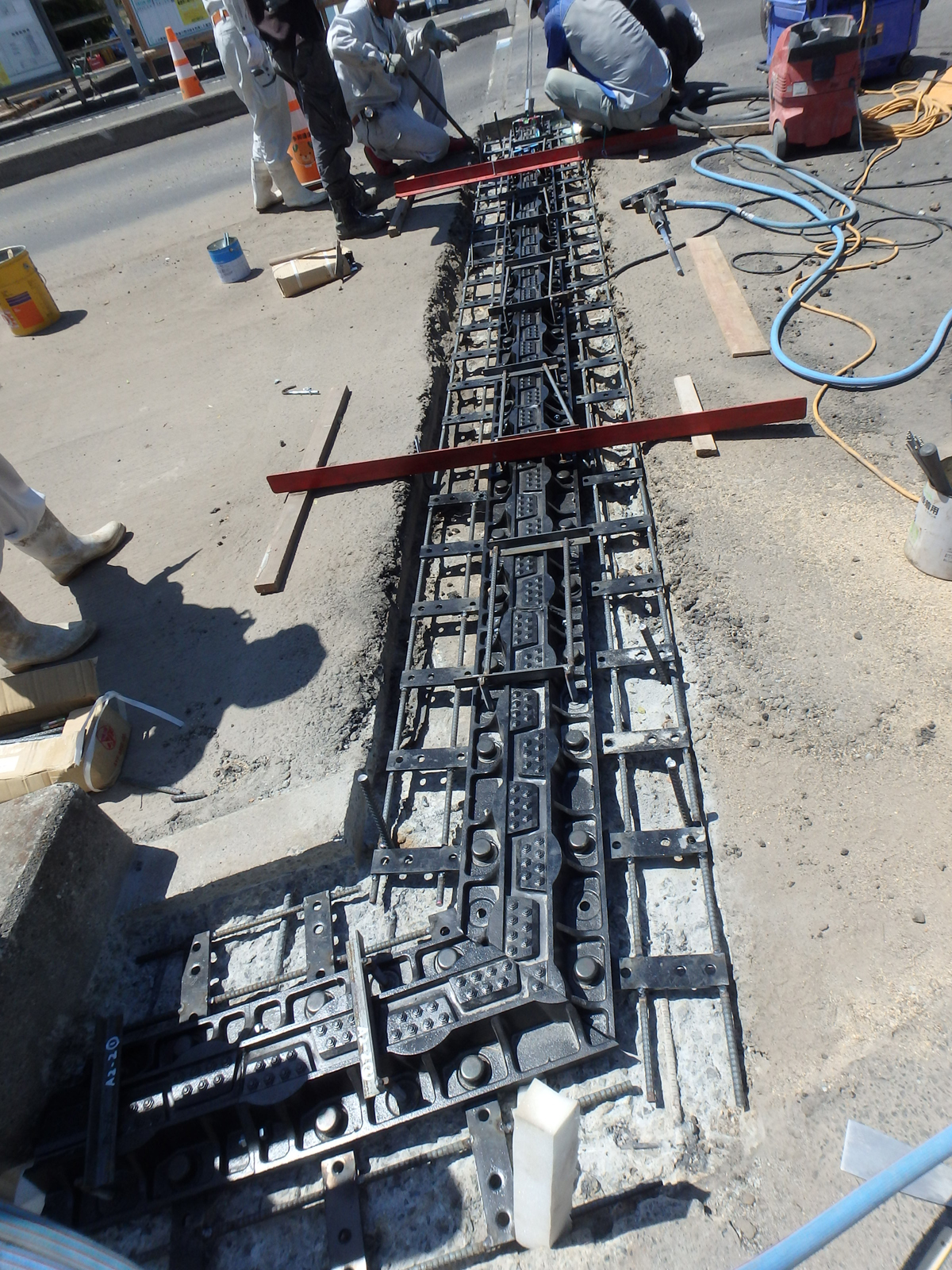 施工は、ジョイントブロック(一体成型できる最大は900mm×遊間幅)どうしを現場の幅員に合わせて、橋軸直角方向に鉄筋を通して繋ぐ。次に既存製品を撤去し、型枠を遊間に設置し、製品をクレーンで遊間内に吊り降ろして、位置調整してセットし、既設床版の配筋に固定する。無収縮モルタルを流し込んで、最後に表層50mmのアスファルト舗装を敷設して完成となる。