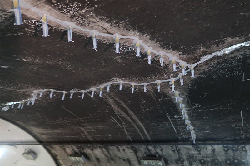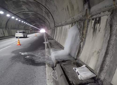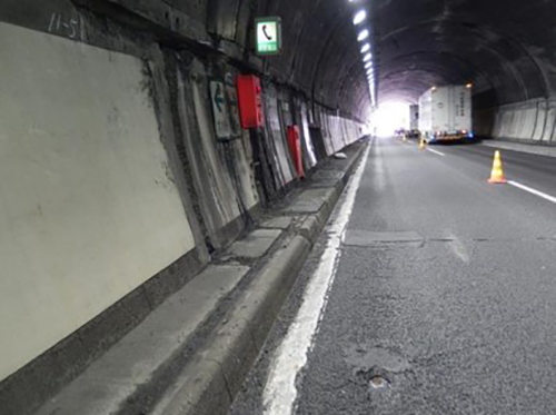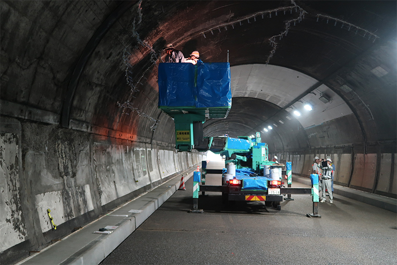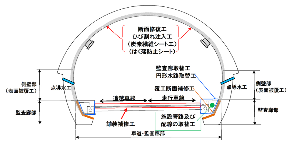 その補修工事として、ひび割れ発生箇所にエポキシ樹脂を注入し、断面修復を実施した。対面通行規制期間後、車線規制工事により、炭素繊維シートとはく落防止シートの貼り付けを行うと同時に、監査路上から本線に直接影響しないと考えられる75度を超えない範囲で側壁部の表面被覆工を施工する。覆工コンクリートのはく落対策としては、ShieM-TN工法を採用。