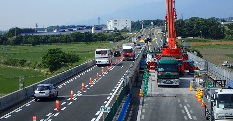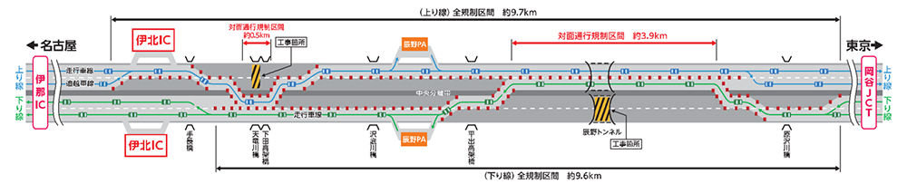 今回のリニューアル工事では、「車線規制が総延長約10kmと長い距離になるため、規制区間の安全対策や、規制区間を利用されるお客さまへの情報提供の検討を重ね、実施した」(NEXCO中日本)ほか、「規制期間をできるだけ短くする」(同)ための検討も行った。