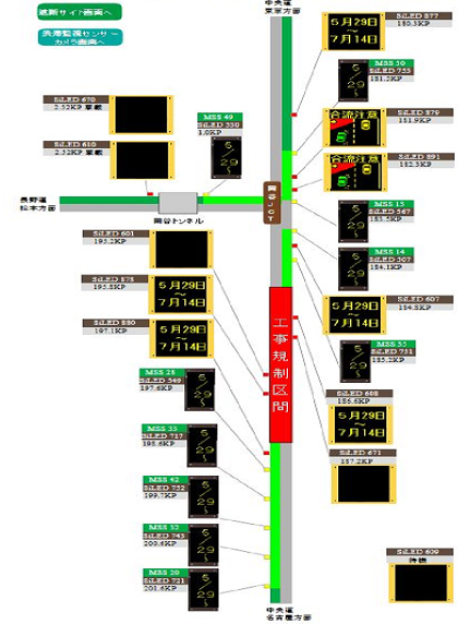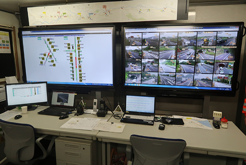 具体的には、渋滞情報などを伝える簡易情報版の設置台数を昨年秋のリニューアル工事時よりも規制延長の増加にともない23台増やして45台とし、Bluetooth、およびモバイルスピードセンサー(MSS)を活用して区間の所要時間と渋滞最後尾の位置情報の提供を行ったほか、交通監視員や渋滞監視車、24台のWEBカメラなどにより現場の交通状況を交通監視室で集約し、道路管制センターとの情報共有を図った。