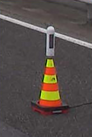 対面通行規制区間の事故防止対策としては、視線誘導と速度抑制のためにポストコーン上部に走行型視線誘導灯(※右写真)を設置した。