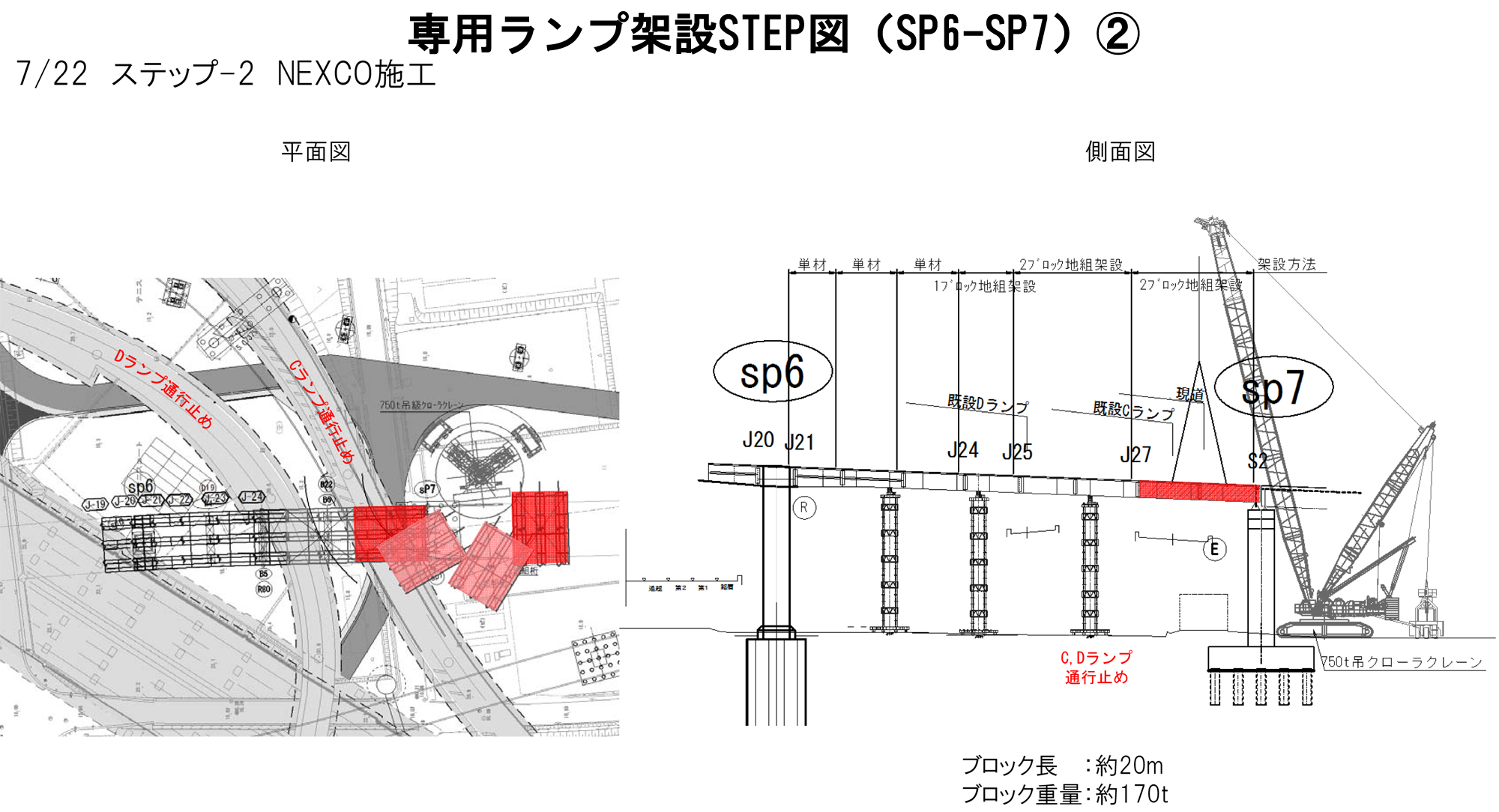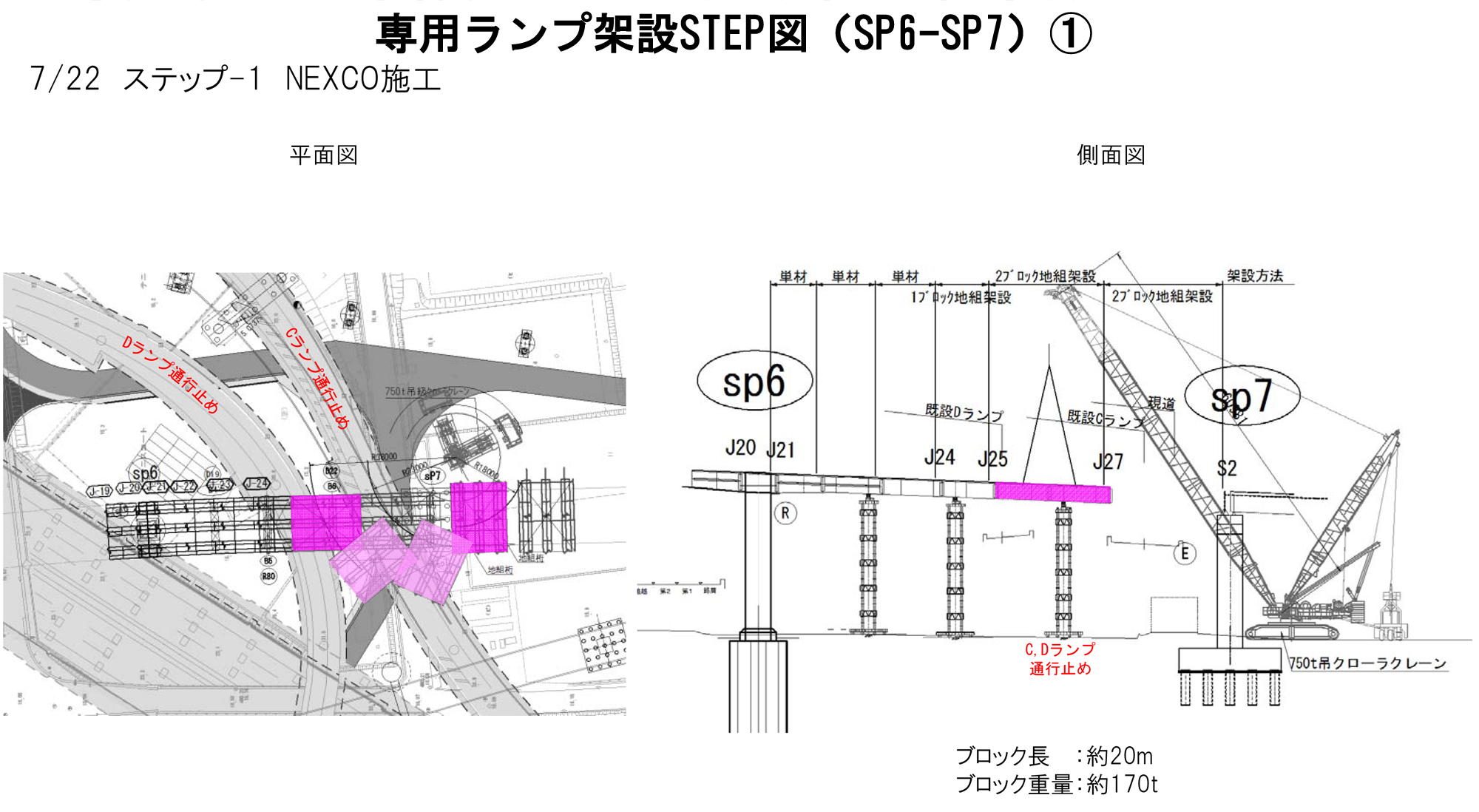今秋には東名高速道路本線を跨ぐSP5-SP6およびap9-ap10の2本の桁を1600t吊クレーンで架設する工事も控えている。bおよびh連結路と架設中の専用ランプの間にある、既存道路を一時的に占有しているヤード上に1600t吊(ブーム長は102m)クレーンを組立、桁を地組みし、架設するものであり、今回の架設当日は桁の地組みを行っていた。クレーンそのものは9月初めから組み立てを始める。東名本線を跨ぐ桁部分は、ブームで所定の高さまで吊り上げて、徐々にブームを前に倒していき、所定の位置に据え付ける手法を採用する予定で旋回は約90°に留める。専用ランプを隔てた東側では同日に宮地エンジニアリングが1250tクレーンを使って新設b連結路、h連結路の桁を架設する予定だ。