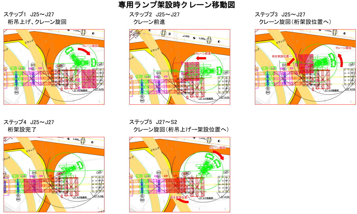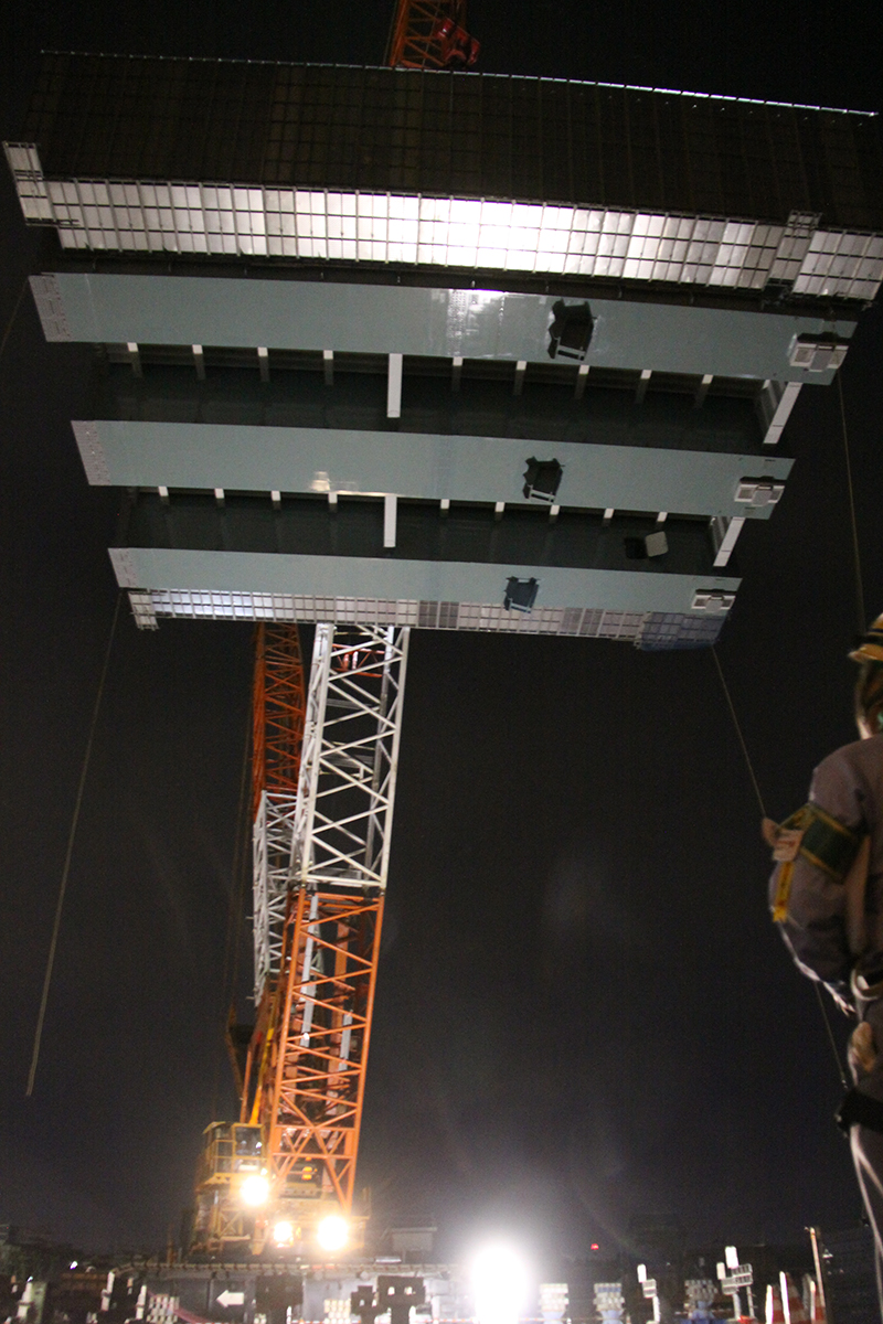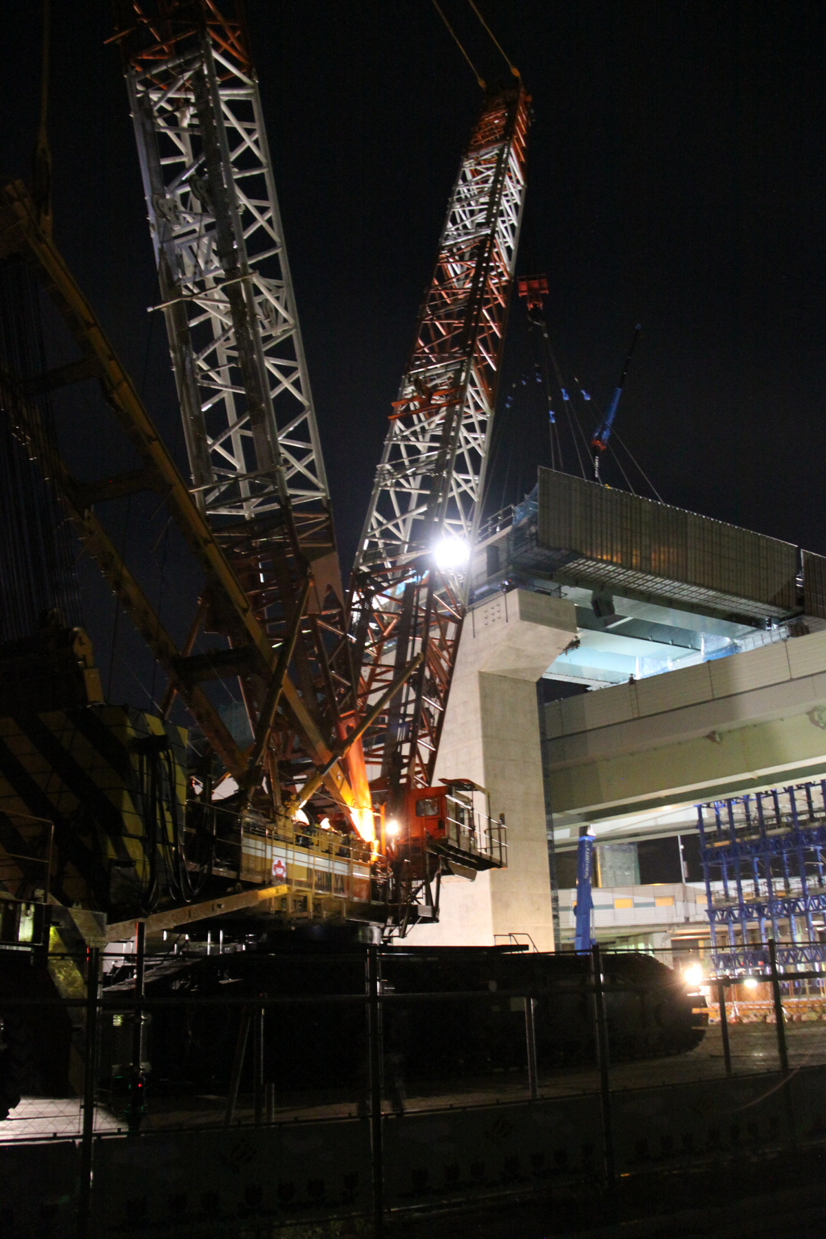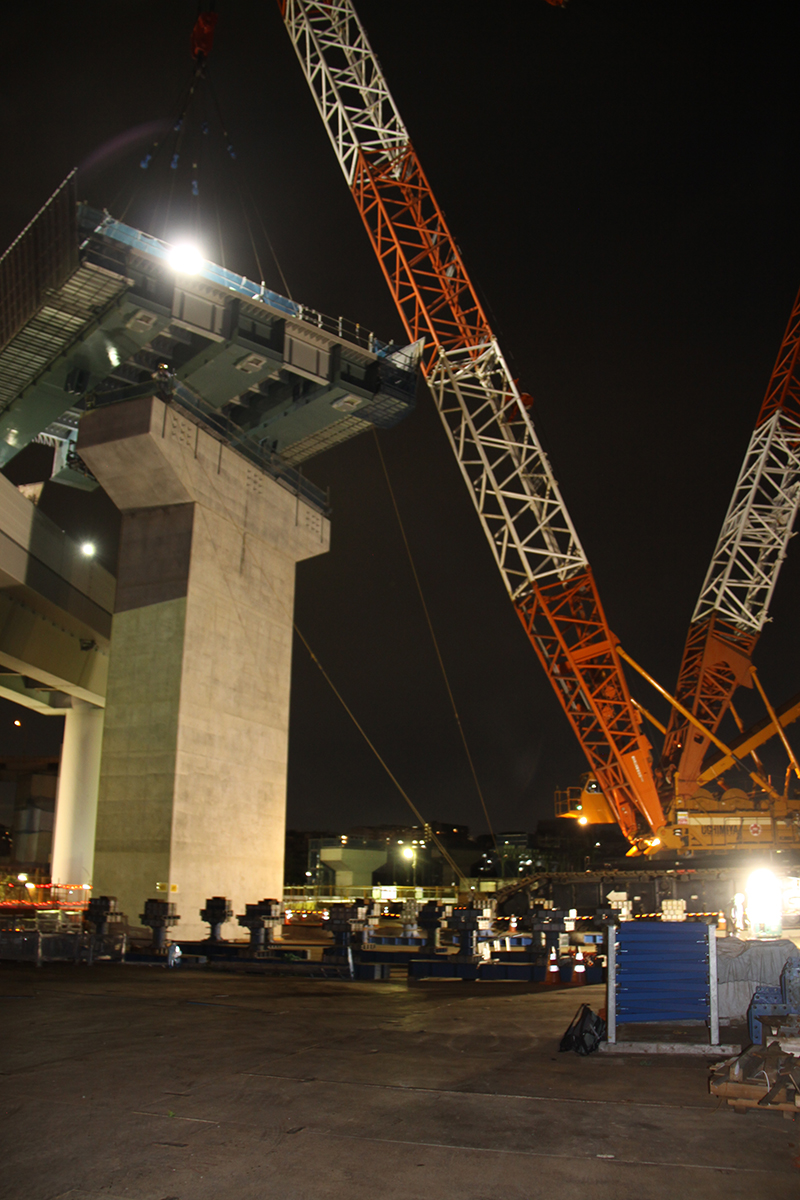 架設に使用したクローラークレーンは750tの吊り能力を有する「スーパーヘビーリフト」を採用している。ブーム長は60m、作業半径は38mで運用するが、作業半径が足りない部分を補うため、本体の後ろにワゴンをつけてカウンターウエートを約240t配置し、それを引きずることで反力を取って旋回架設している。現場ではまず所定の高さまで巻き上げた後、(旋回半径の幅を稼ぐため)クローラークレーンそのものを少し前進させなければならない。しかし、当初のタイヤの向きでは前進できないため、アウトリガーで抑え込むことによって、タイヤの向きを90°変えて前進した上で、旋回を開始した。その後、地組みヤードから供用中の一般道路を阻害しないように出来るだけヤード上、次いで通行止めしているCランプの上を180°旋回して桁を所定の位置まで運んだ。1回目の吊上げは22時10分過ぎに開始、2時間弱ほどで仮添接まで完了後、2回目の吊上げは0時35分に開始、3時頃には桁を所定の場所に据え付けた。