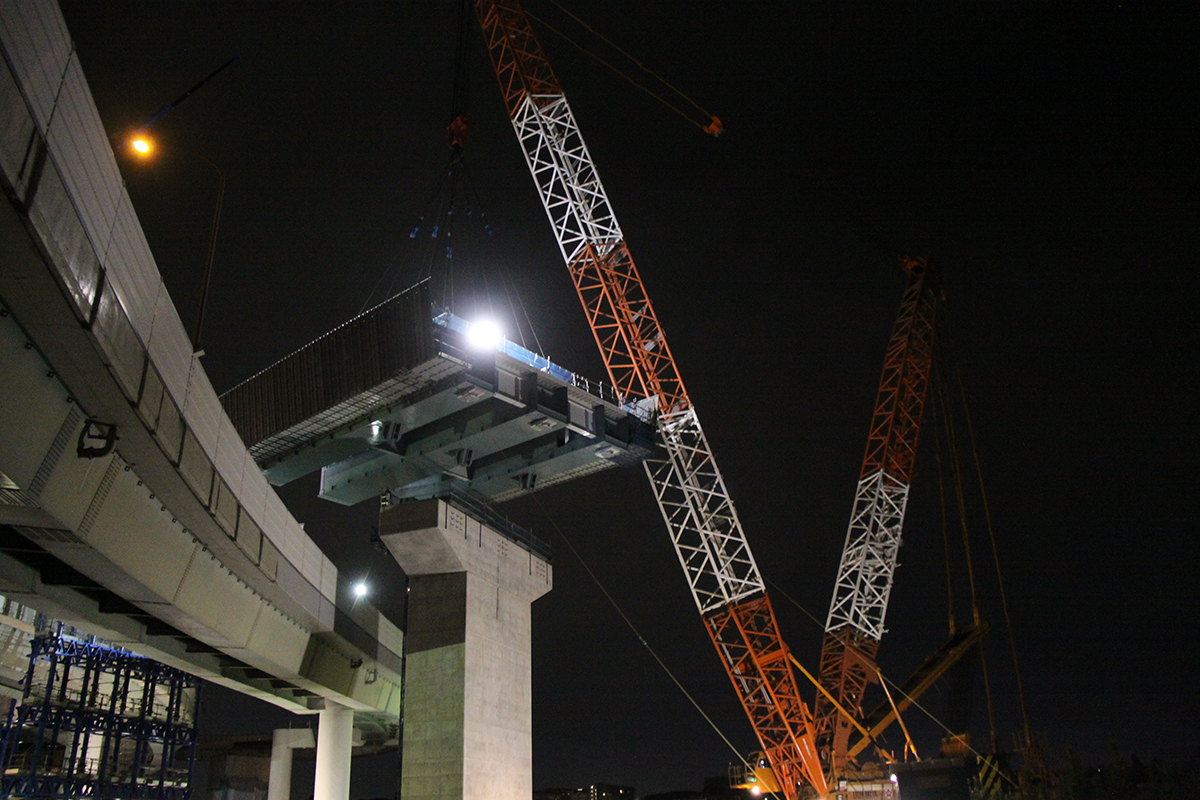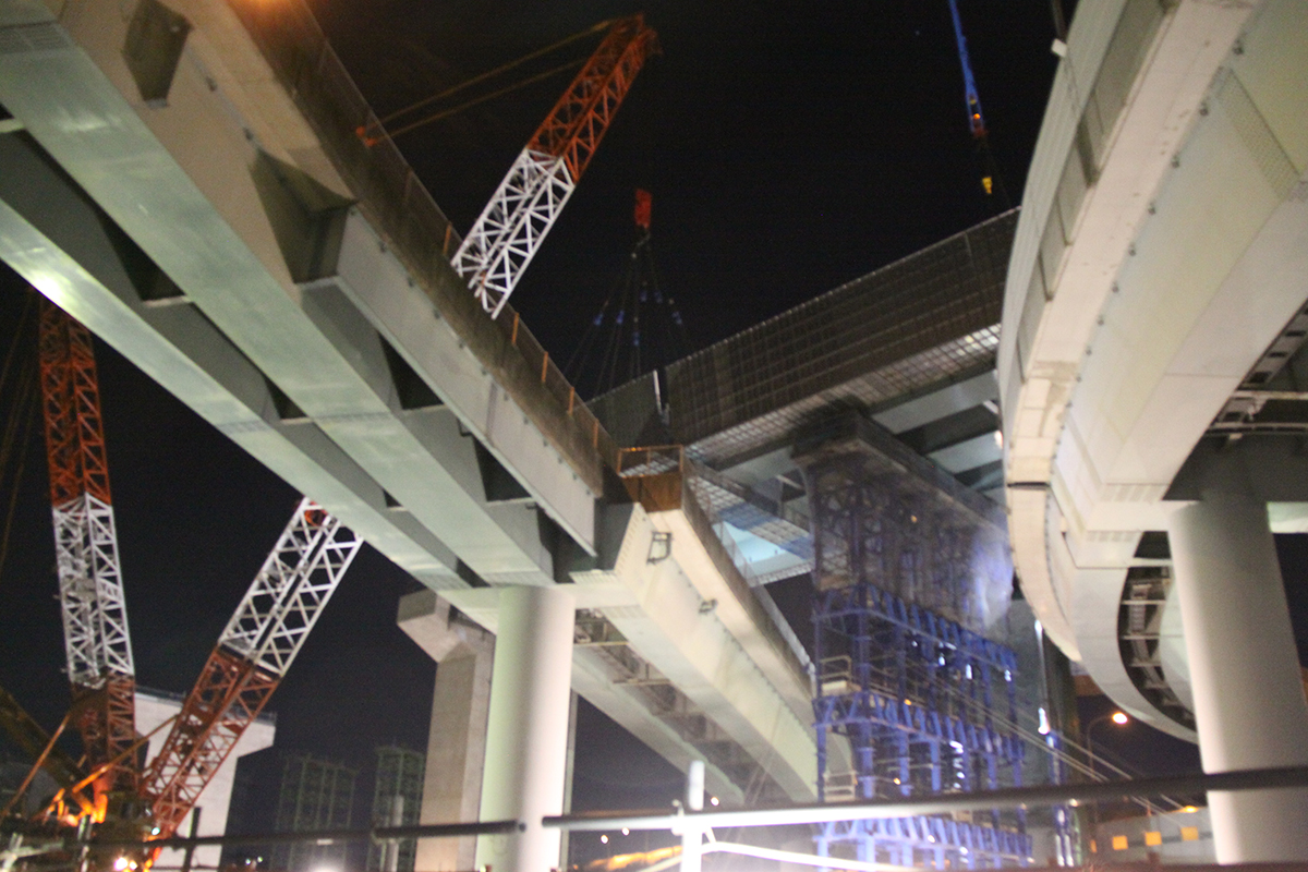 今秋には1,600tクレーンを用いて東名高速道路直上を跨ぐ桁を架設