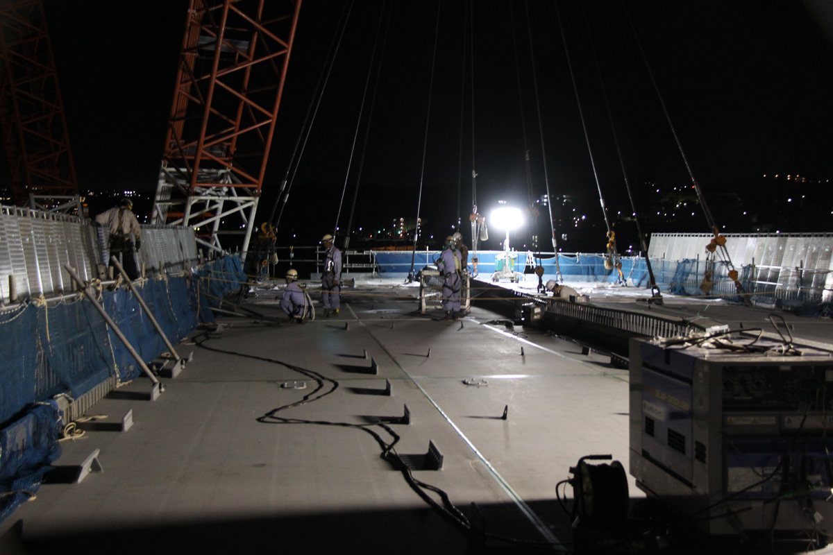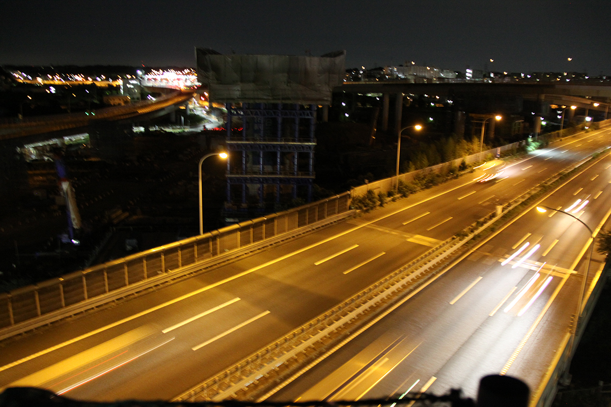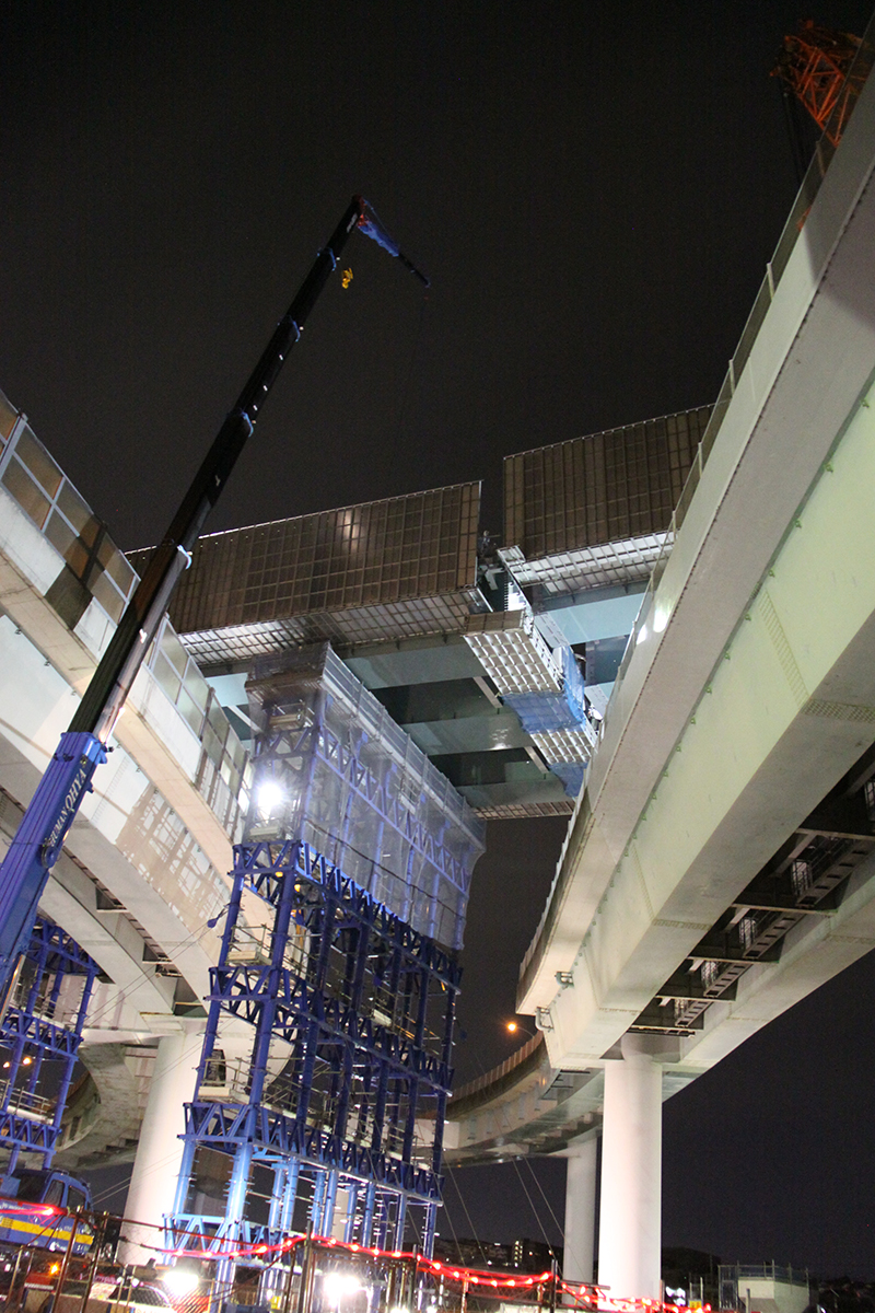 首都高北西線専用ランプ橋の東名横浜青葉ICランプ上での夜間架設