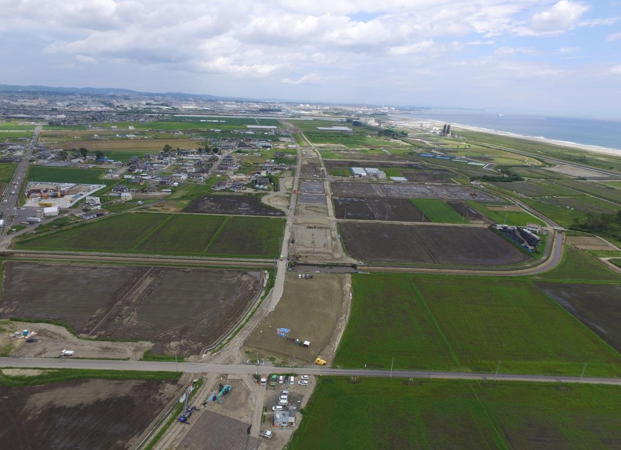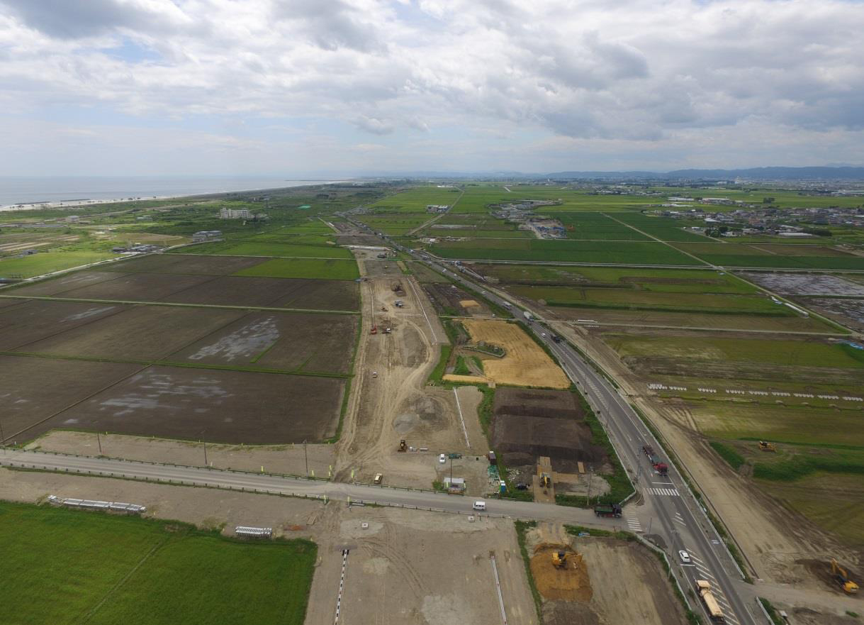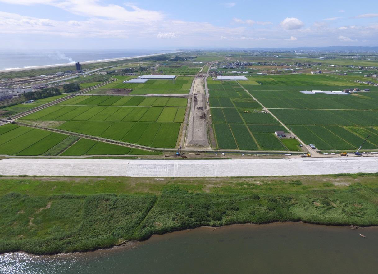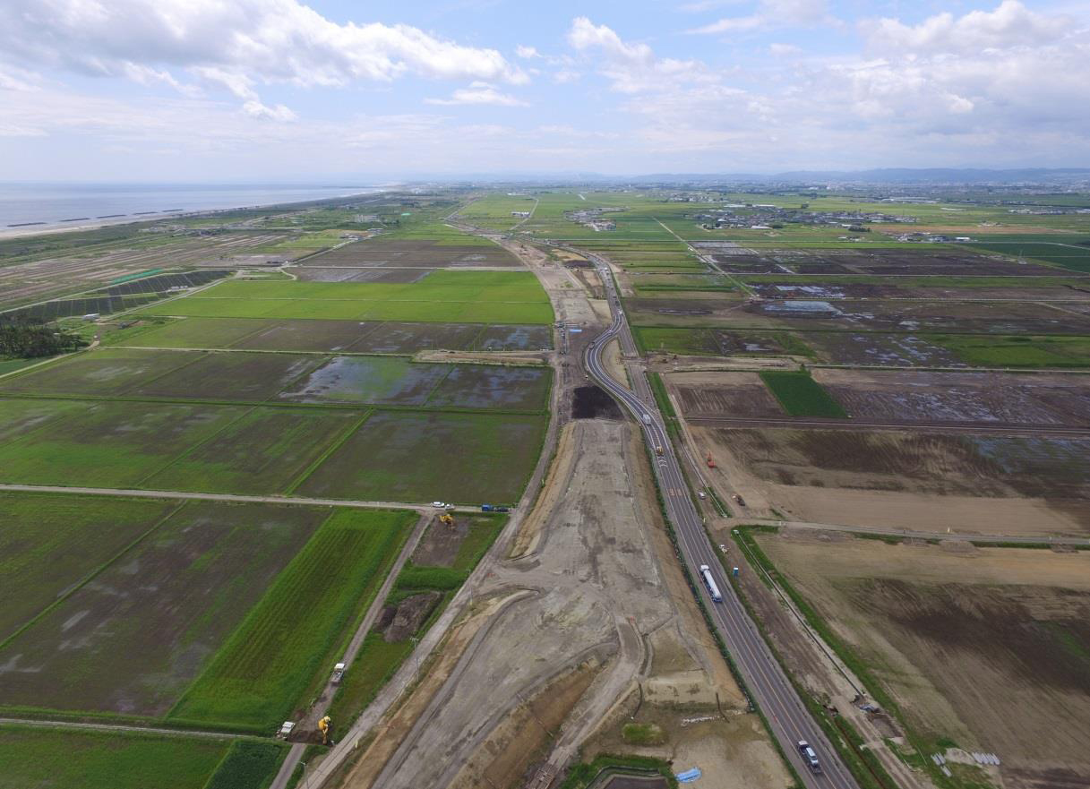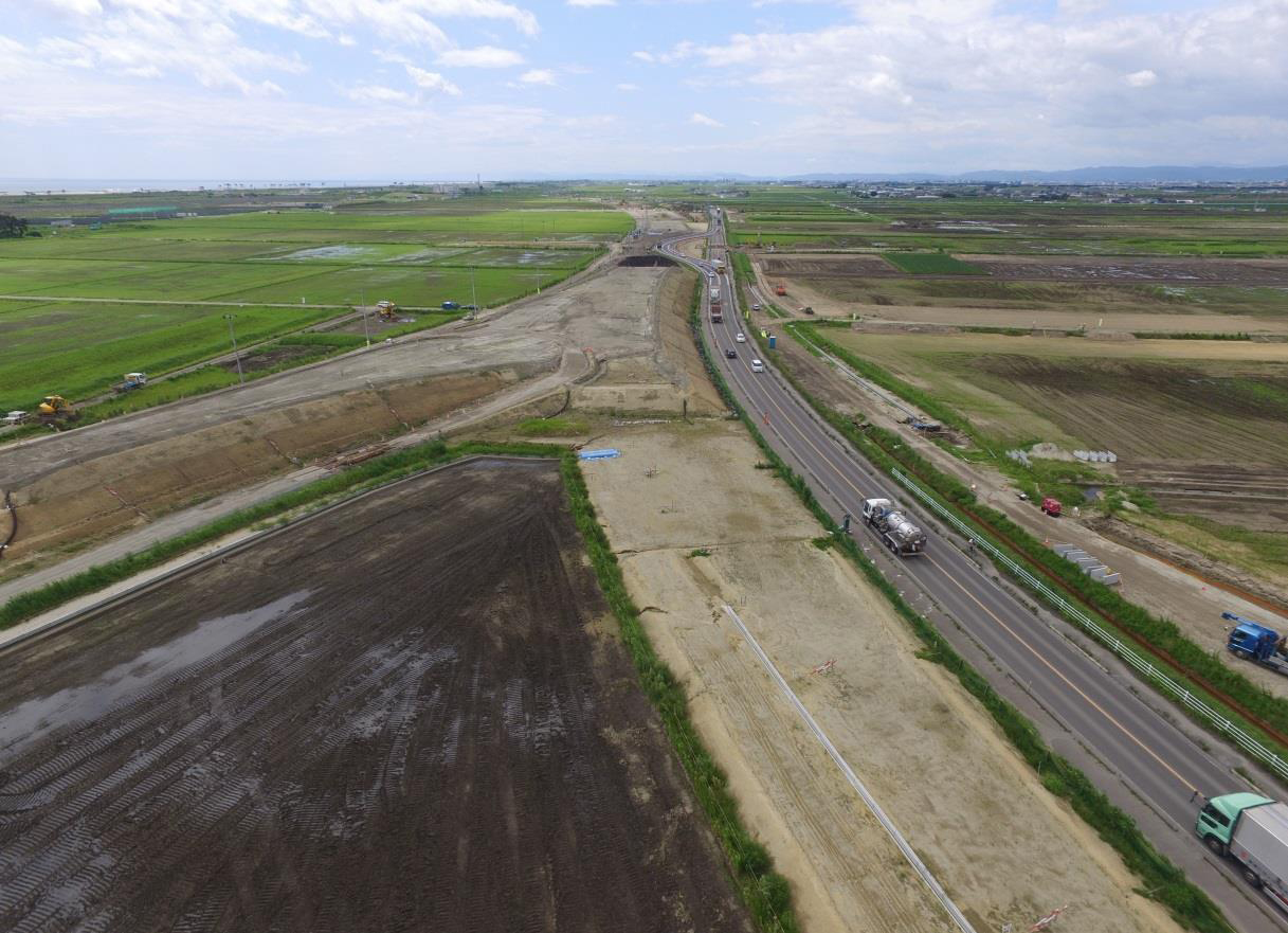 一線堤として防潮堤をかさ上げしており、かさ上げ道路が二線堤(内陸側の第二の堤防の役割)の機能を持つことになる。30年度末までの供用に向けて事業を進めており、現在は一部の盛土が完了している。盛土施工中の箇所が大部分で、未着手部分は今秋に着工予定だ。ただし、若干の用地取得が残っている。