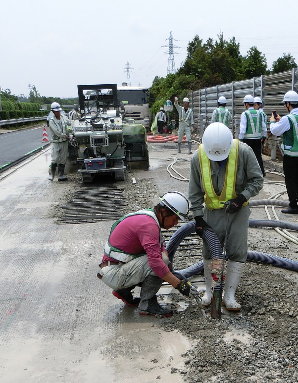 同ユニットは、打ち継ぎ端部ぎりぎりまではつり施工できるため、NEXCOの一部の現場で見られるような端部形状を綺麗にするためのダイヤモンドカッターによる施工がほぼ不要であり、余分な工程やマイクロクラックの発生が抑制できる。ガラの直径が従来比半分になったことで濁水・ガラ吸引作業に要する時間を従来比約半分に短縮でき、人員も同様に従来の5~3人から2~1人に省人化できる見込み。人員減によるコスト縮減は限定的だが、今後の現場工事に従事する作業者の減少を考慮すると「省人化は効果的」(NIPPO)としている。