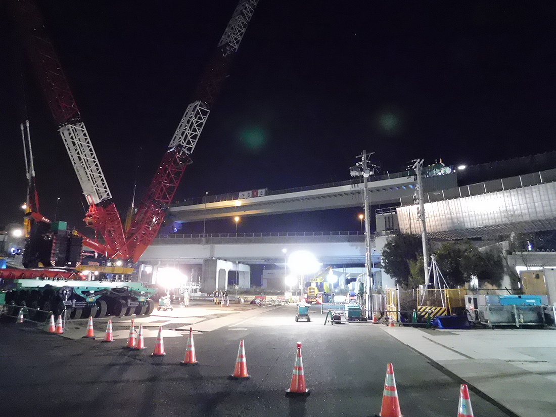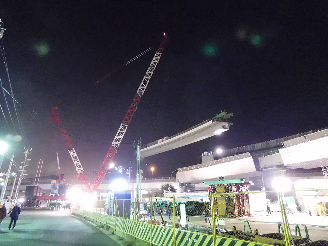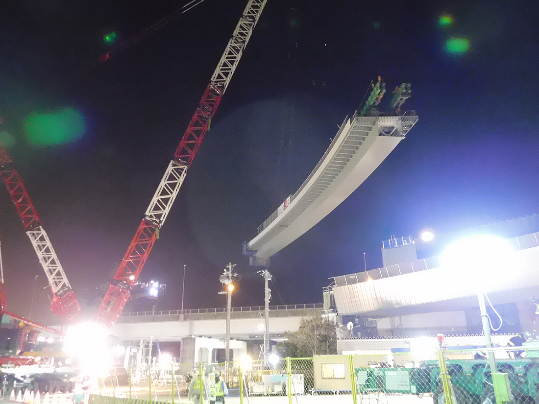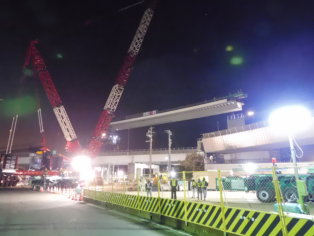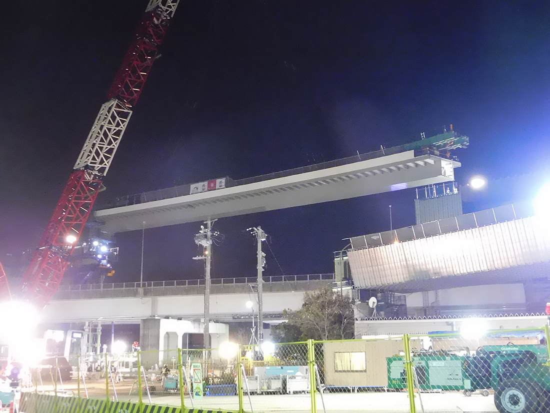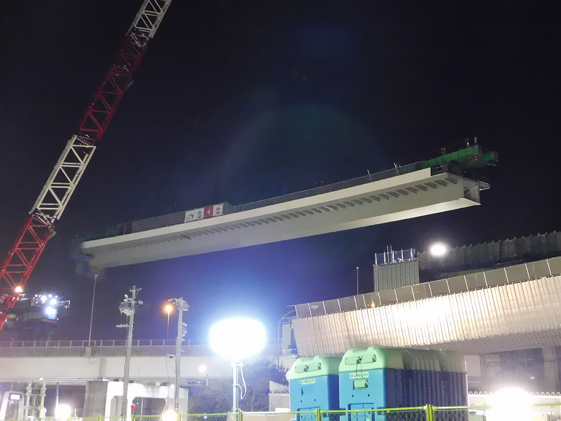 本架設後、1月27日夜にAランプ橋J42-P77(ブロック長82.7m、吊上重量約435t)、2月3日夜にDランプ橋J24-J30(ブロック長46.8m、吊上重量約211t)の架設を完了、2月17日夜にCランプ橋J16-J25(ブロック長75.8m、吊上重量約422t)の架設を行う予定だ。