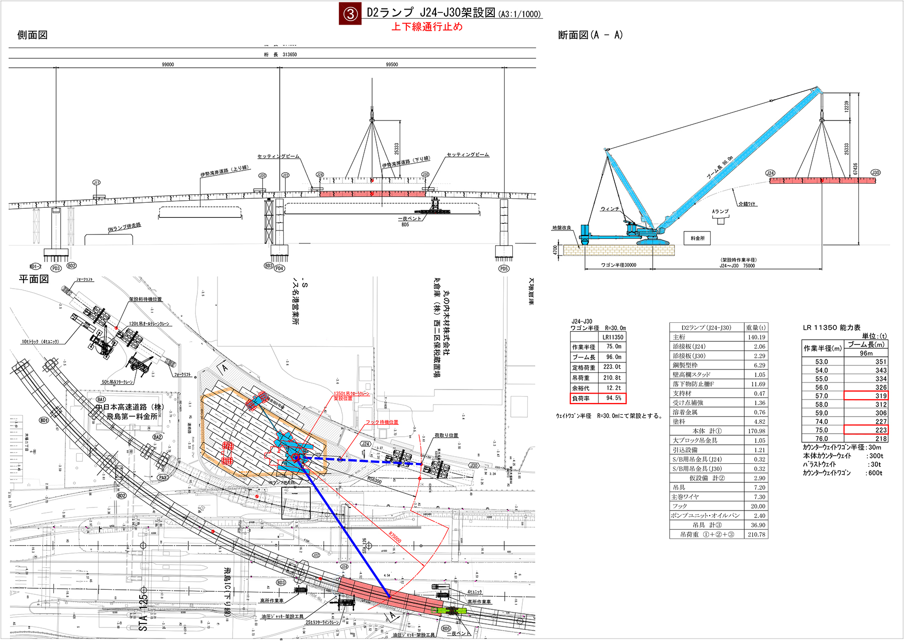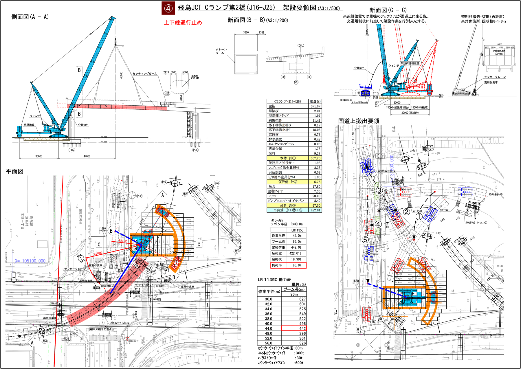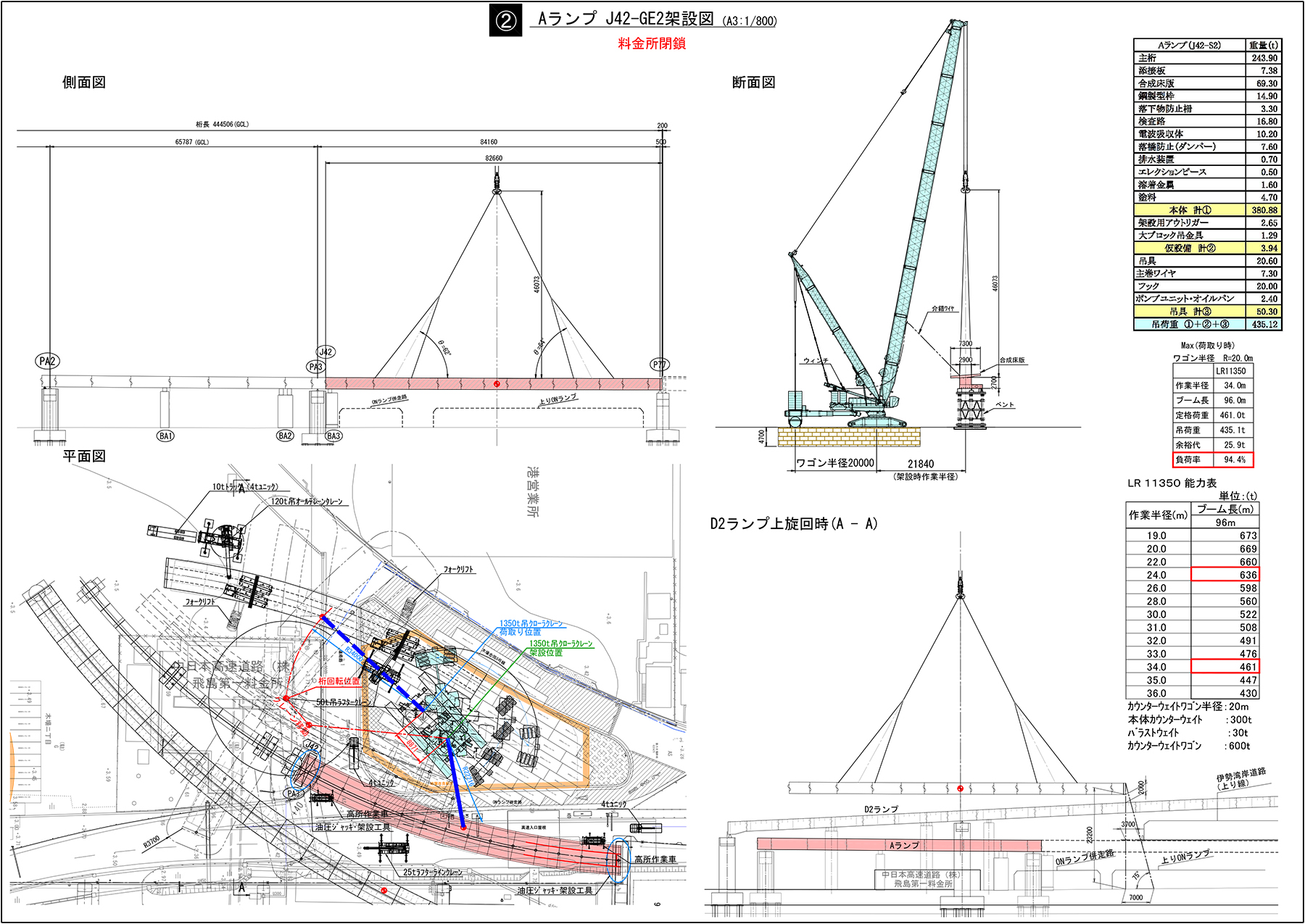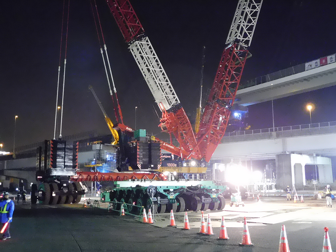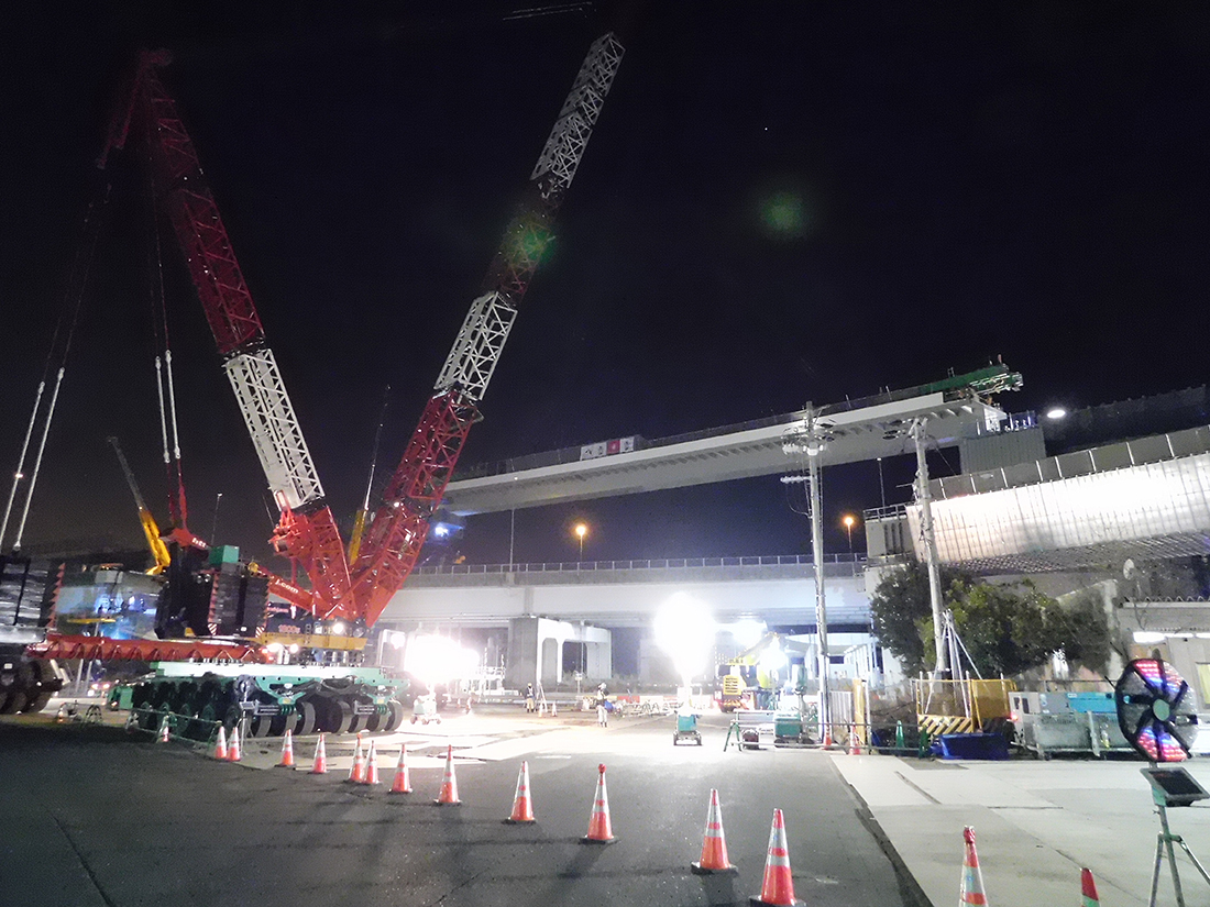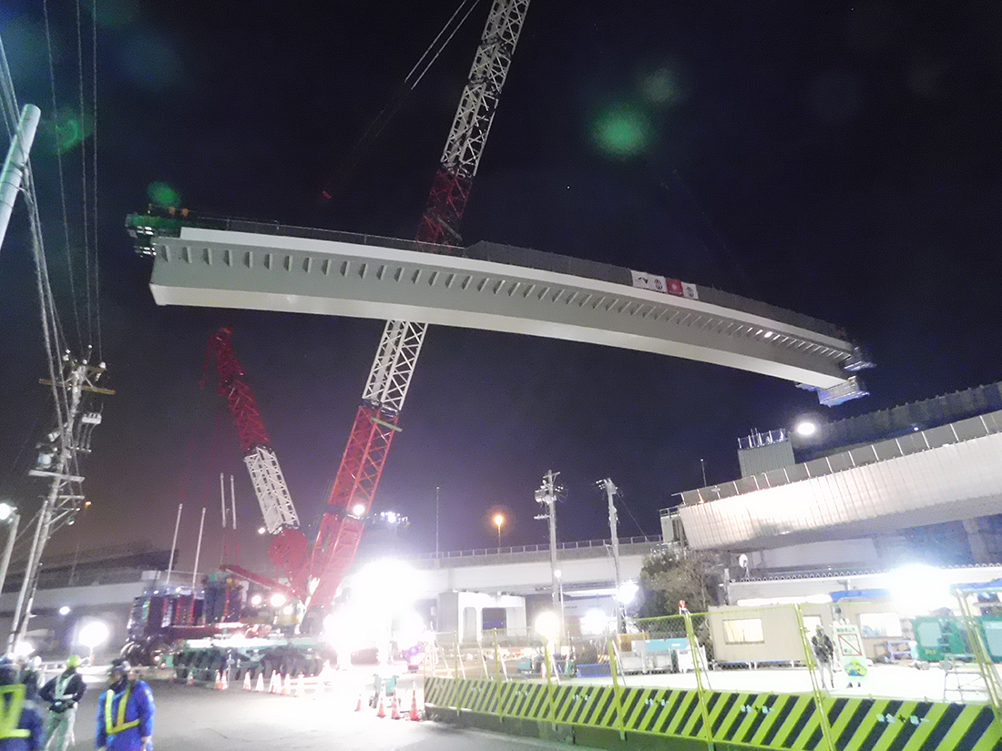 本架設後、1月27日夜にAランプ橋J42-P77(ブロック長82.7m、吊上重量約435t)、2月3日夜にDランプ橋J24-J30(ブロック長46.8m、吊上重量約211t)の架設を完了、2月17日夜にCランプ橋J16-J25(ブロック長75.8m、吊上重量約422t)の架設を行う予定だ。