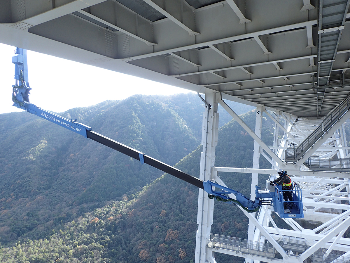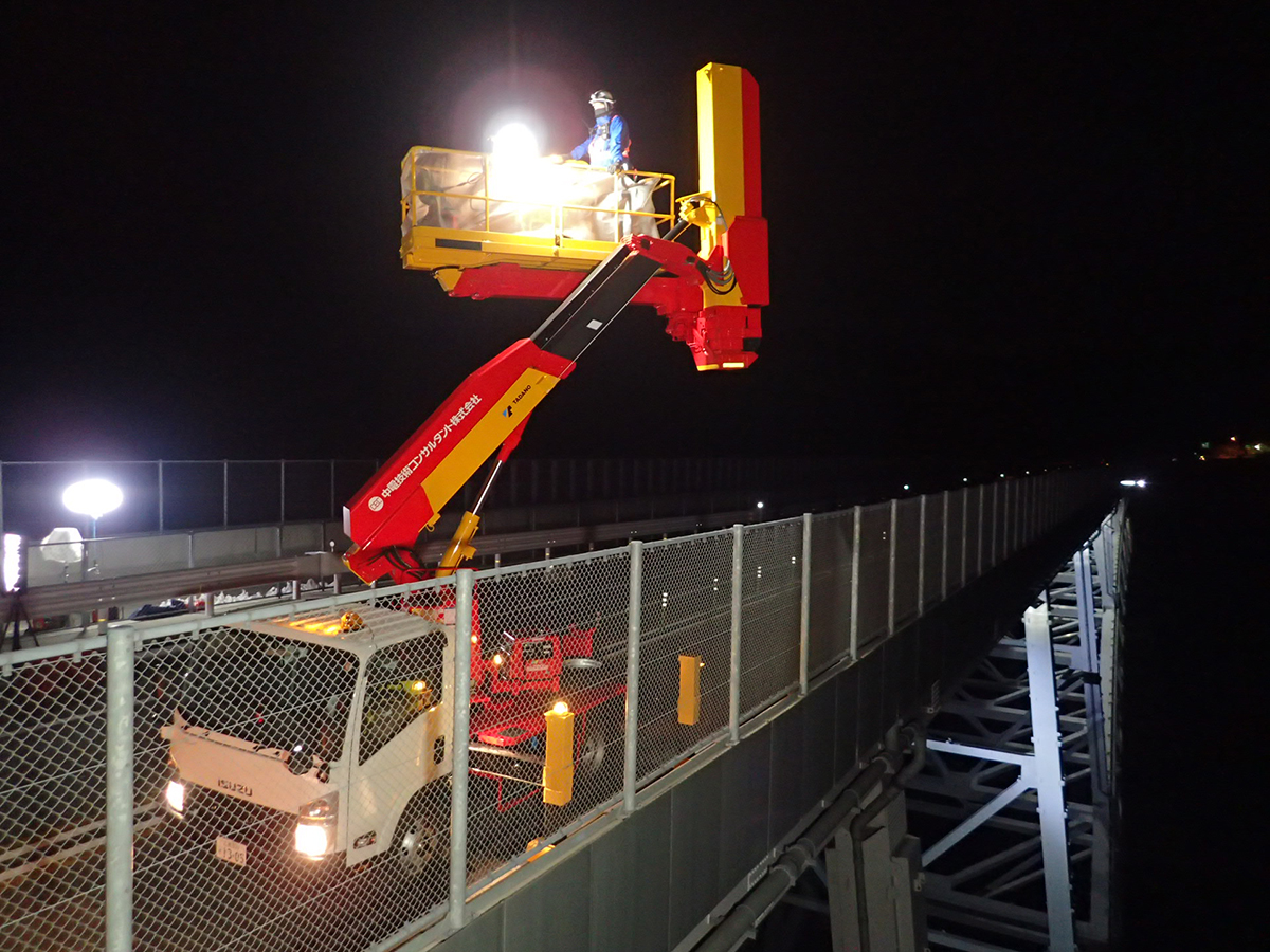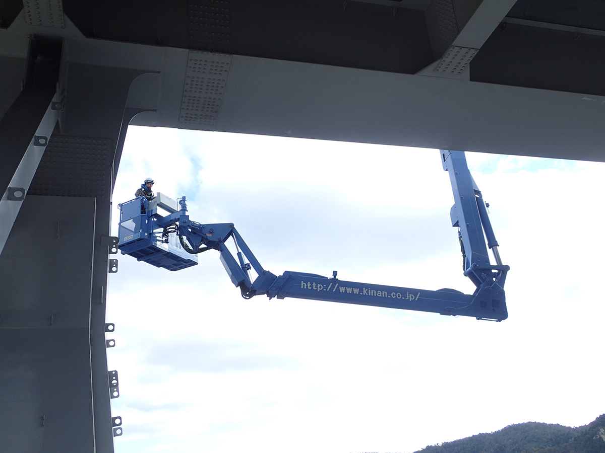 同橋はJR山陽本線を跨いでおり、JR線上の橋梁中央部約100m区間は今回の点検で最も制約が生じた箇所となった。安全確保のために、貨物列車を含めた列車が通過しない深夜の1時間という必要最小時間、日数は2日(12月13日と22日の夜間)で作業を完了しなければならず、1日あたりアーチ部の点検では特殊高所技術者8人、橋梁点検車はBT-400を1台とBT-200を2台の3台を投入した。作業は、片側車線側を特殊高所技術による点検、もう一方の車線側を橋梁点検車による点検と半車線ごとに区切って行い、2日目にその逆の作業を行うことで効率化を図った。