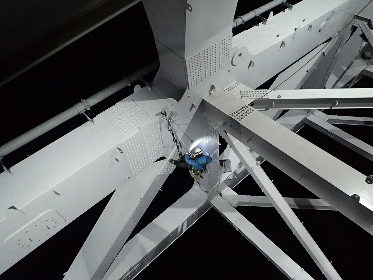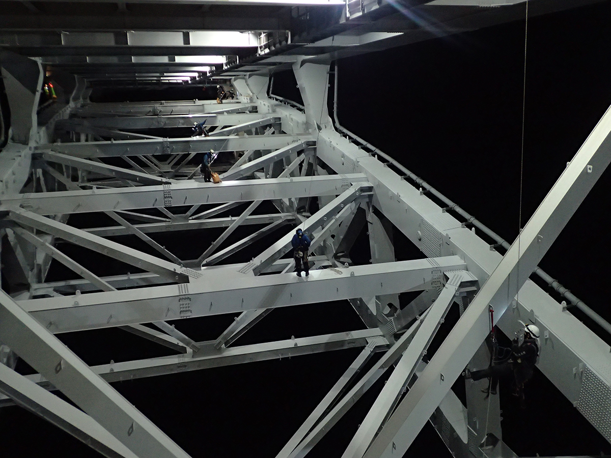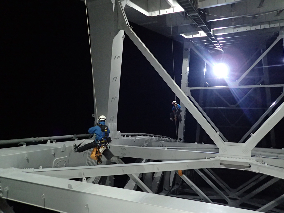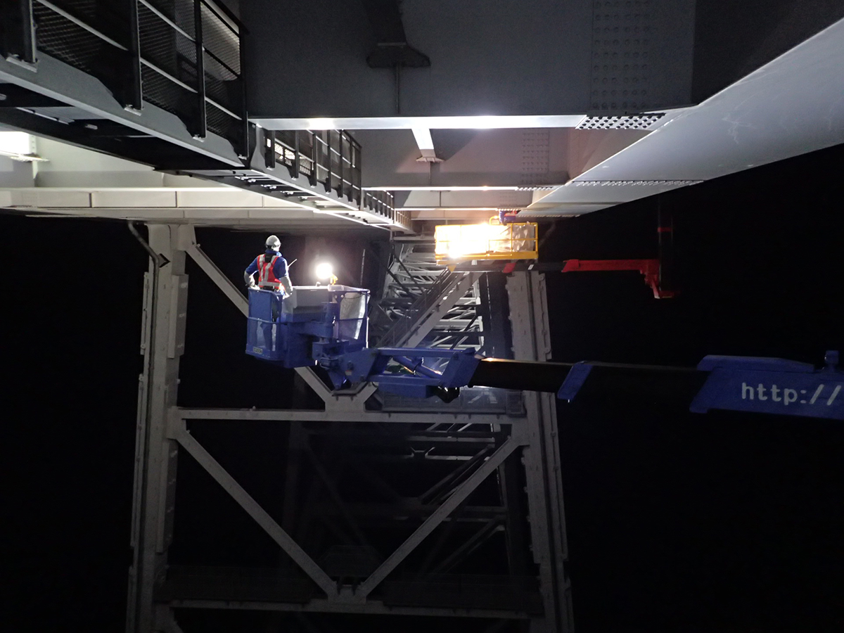 同橋はJR山陽本線を跨いでおり、JR線上の橋梁中央部約100m区間は今回の点検で最も制約が生じた箇所となった。安全確保のために、貨物列車を含めた列車が通過しない深夜の1時間という必要最小時間、日数は2日(12月13日と22日の夜間)で作業を完了しなければならず、1日あたりアーチ部の点検では特殊高所技術者8人、橋梁点検車はBT-400を1台とBT-200を2台の3台を投入した。作業は、片側車線側を特殊高所技術による点検、もう一方の車線側を橋梁点検車による点検と半車線ごとに区切って行い、2日目にその逆の作業を行うことで効率化を図った。