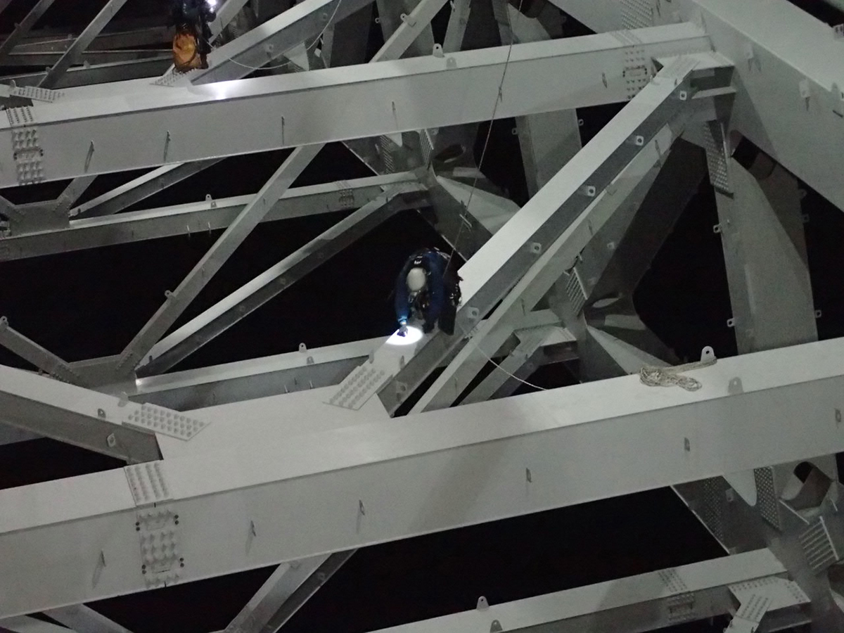 特殊高所技術によるJR線上の夜間点検作業