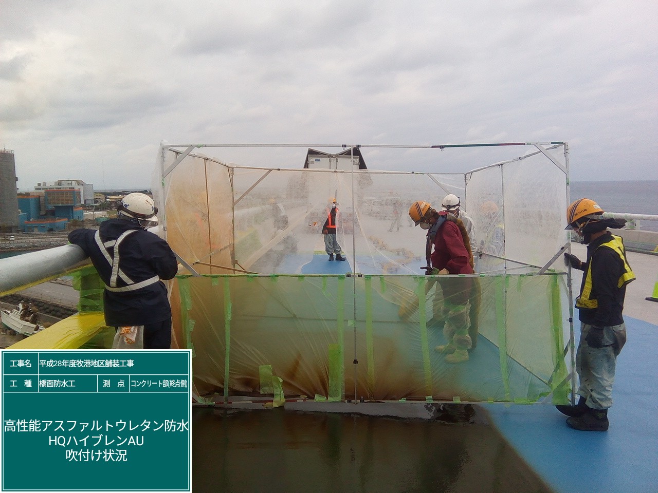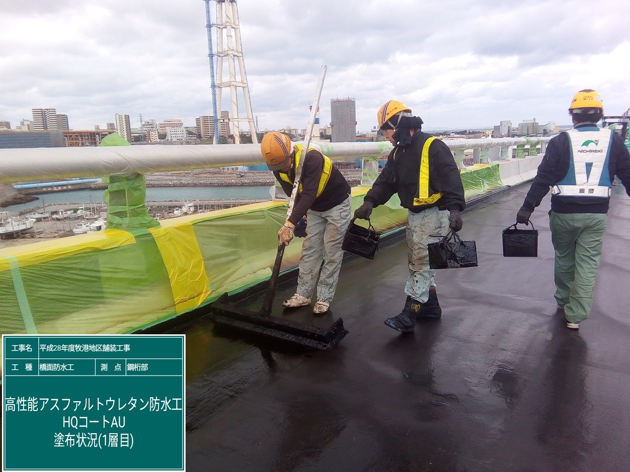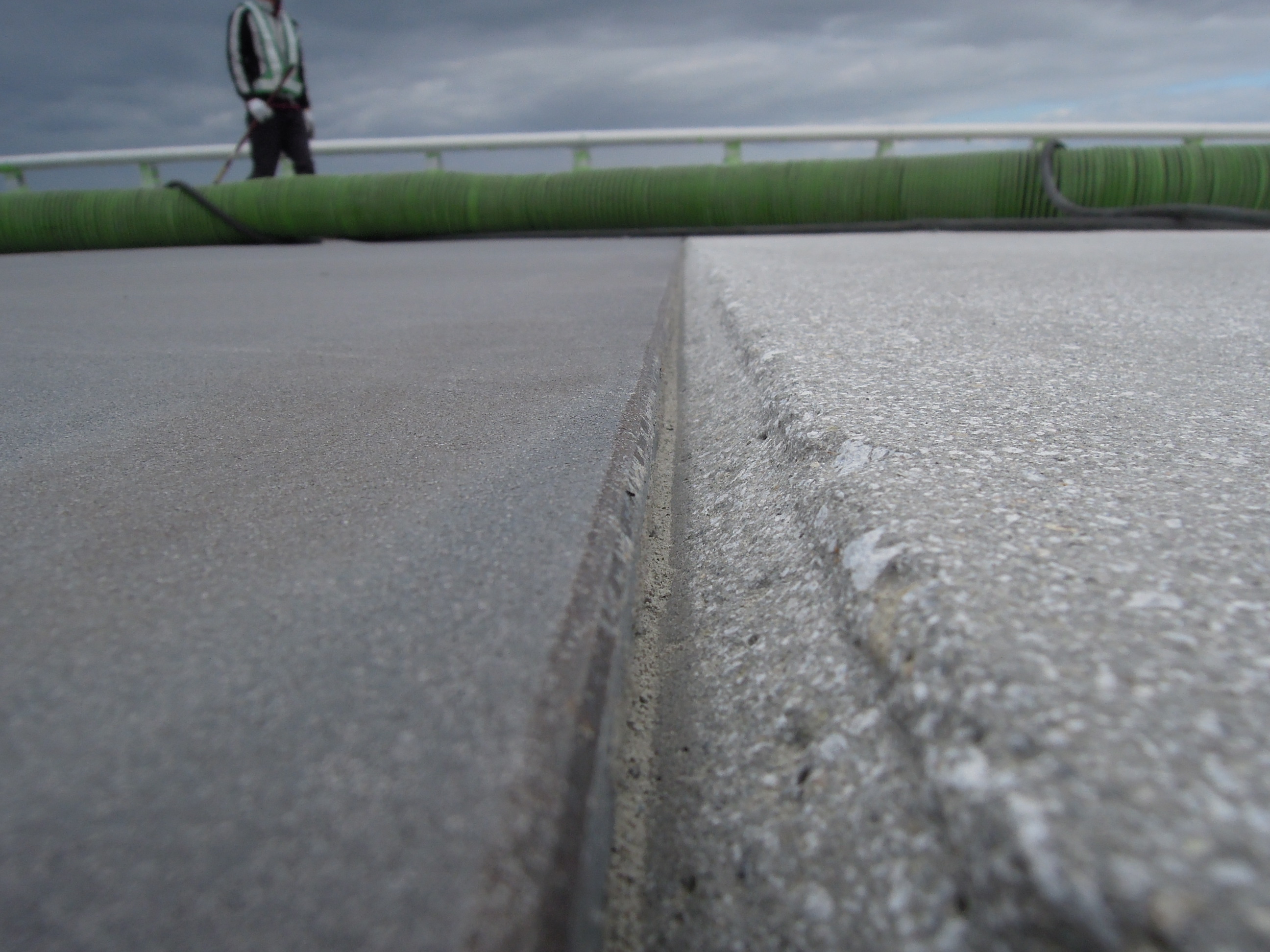 こうしてみると、見えている面より、見えていない面からの水および塩分の進入を阻止することが重要となる。その意味で、一番そうした有害物質が入りやすいのは、桁上面、床版、取り分け鋼床版とコンクリート床版の接合部だ。そのため鋼床版部全体とPC床版との継ぎ目部合わせて1,108㎡に対しては、伸縮に強い高性能アスファルトウレタン樹脂を用いた床版防水(ニチレキ製)、舗装基層は改質Ⅲ型WF(40mm)を採用している。表層は排水性舗装(40mm)。特に接合部については、コンクリート側にコンクリート圧壊防止用のVカットを入れて、防水層と一体打設した上に、たわみ追従性の高い改質Ⅲ型WFの基層を舗設し、さらに上面にクラック防止シートを設置することで、多重の止水対策を施している(一般的なPC桁はアスファルトシート防水、改質Ⅱ型)。