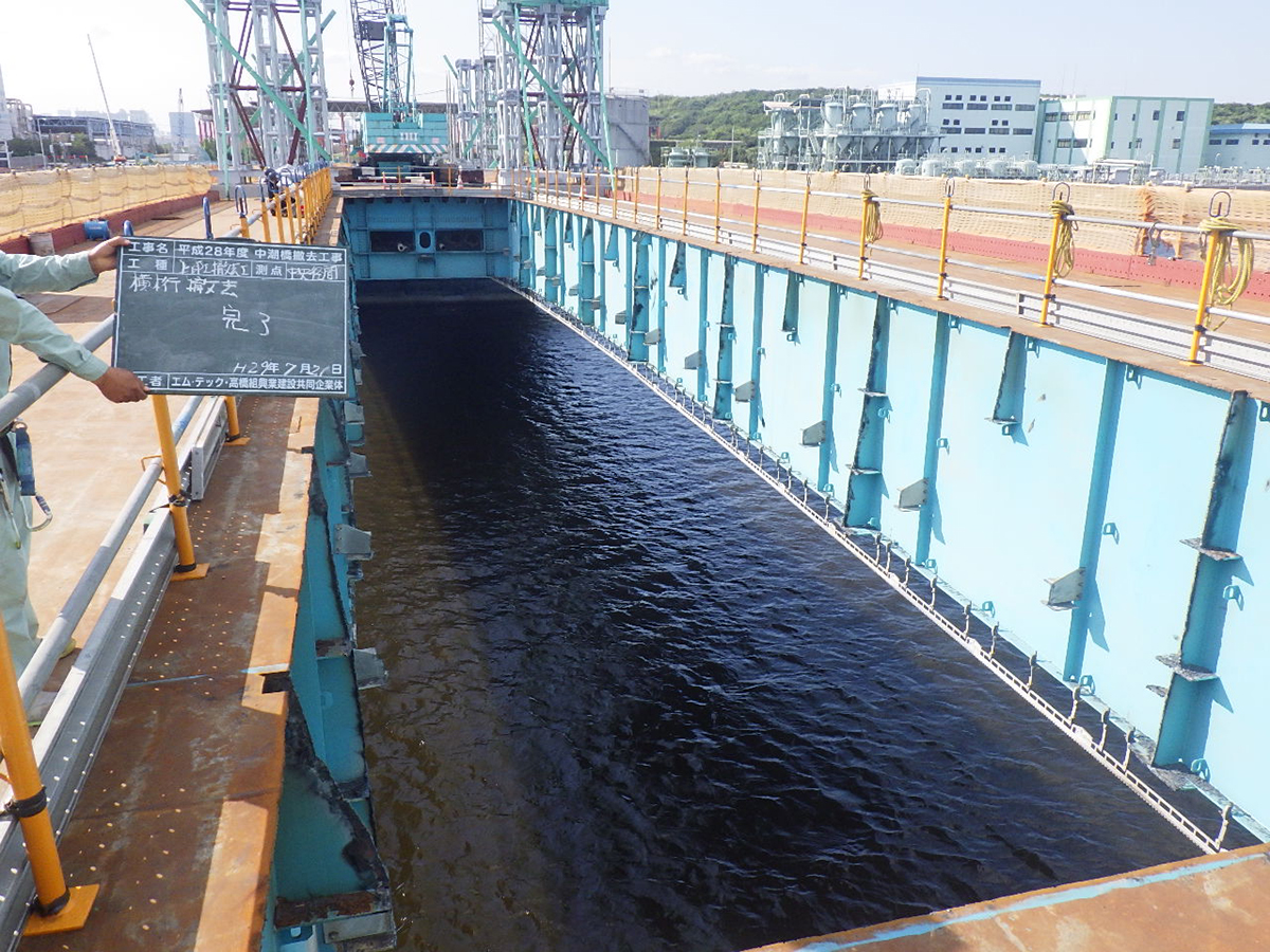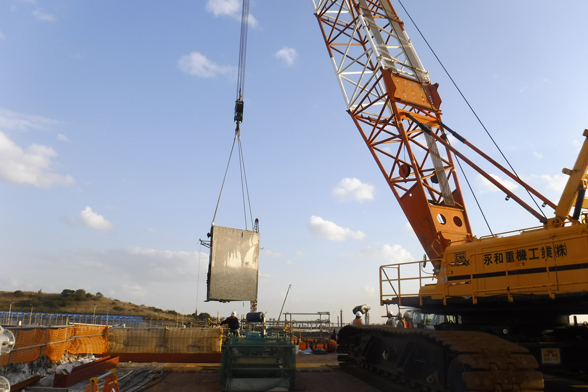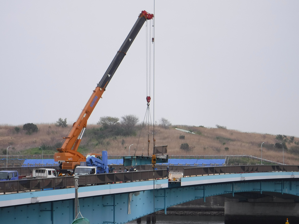 中央径間の張出床版は、安全に撤去できる荷重を確認するためにまず7t程度のピースで試し吊りをした後、全体約100mの撤去を行っている。中央床版は中央径間100mのうち40mを3ブロックに分割して200t吊クローラークレーンで吊上げ、撤去を完了している。片持桁は200t吊クローラークレーンで吊上げ、8ブロックに分割して撤去を行った。