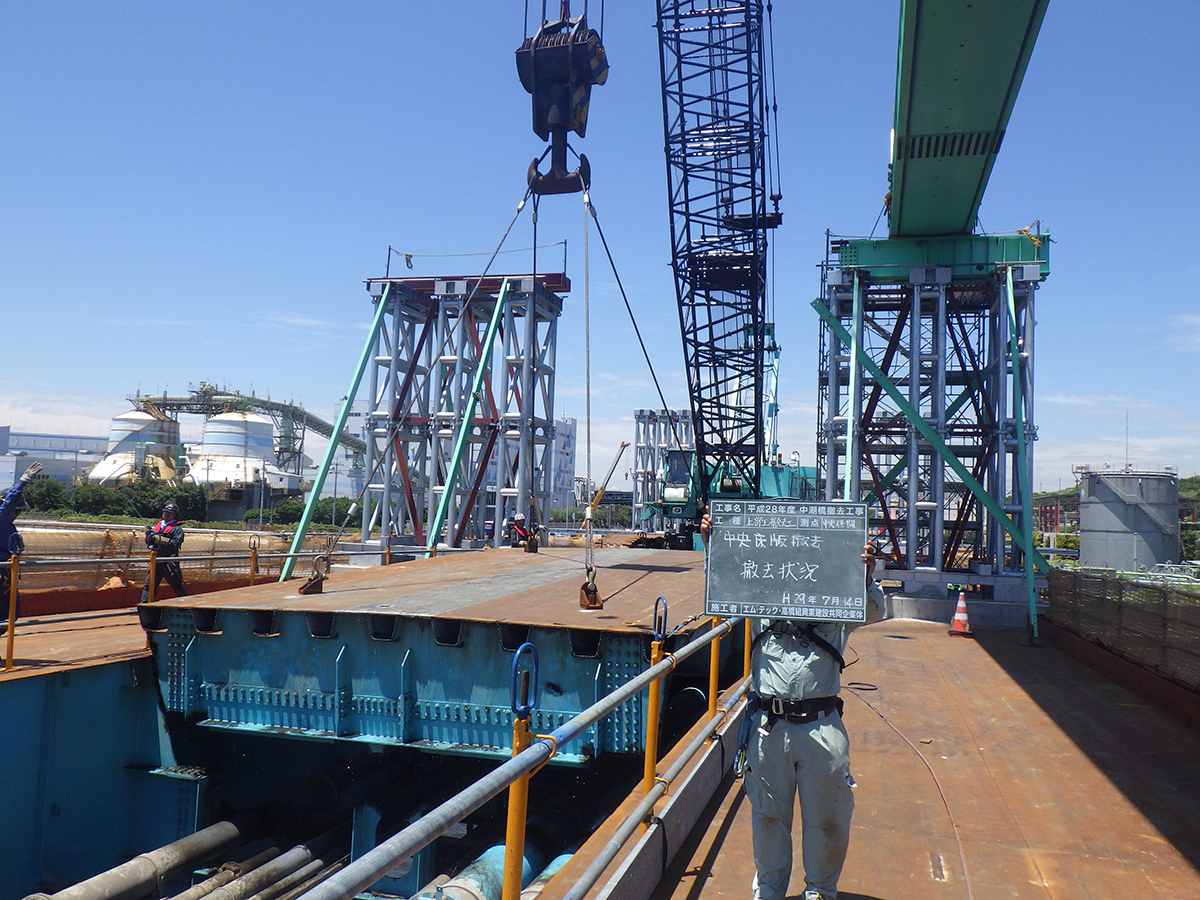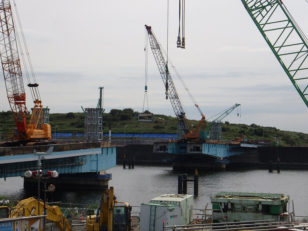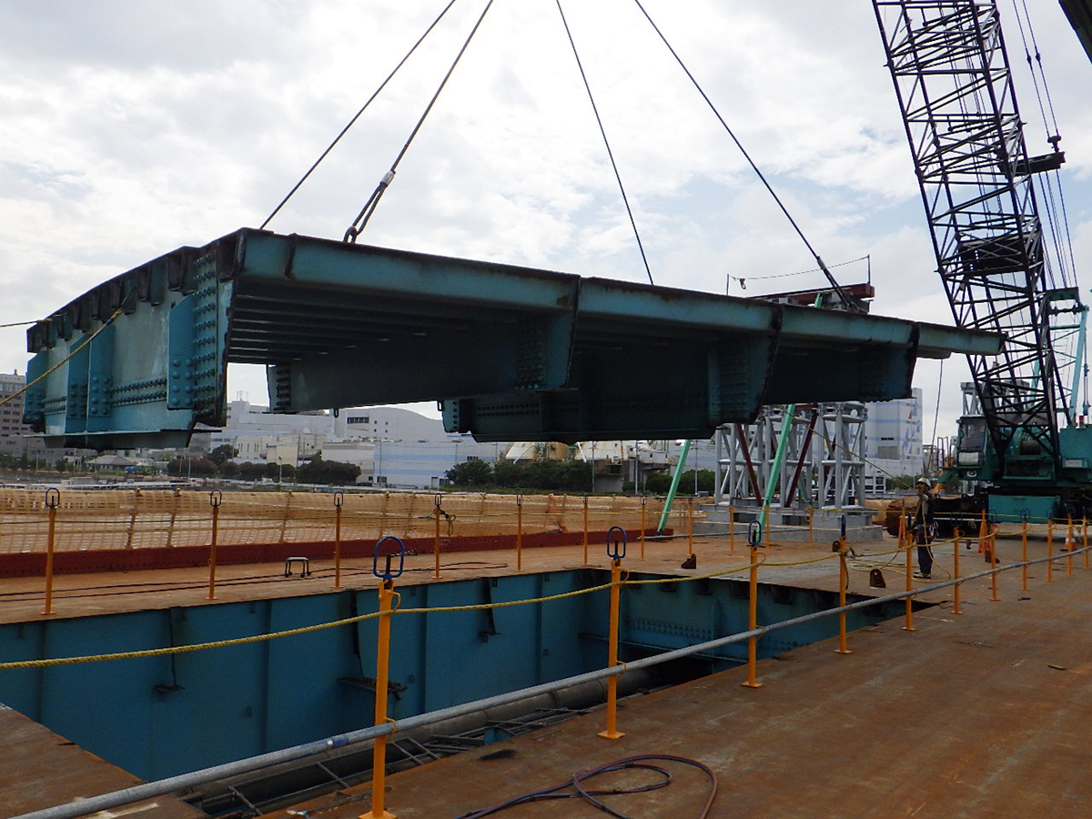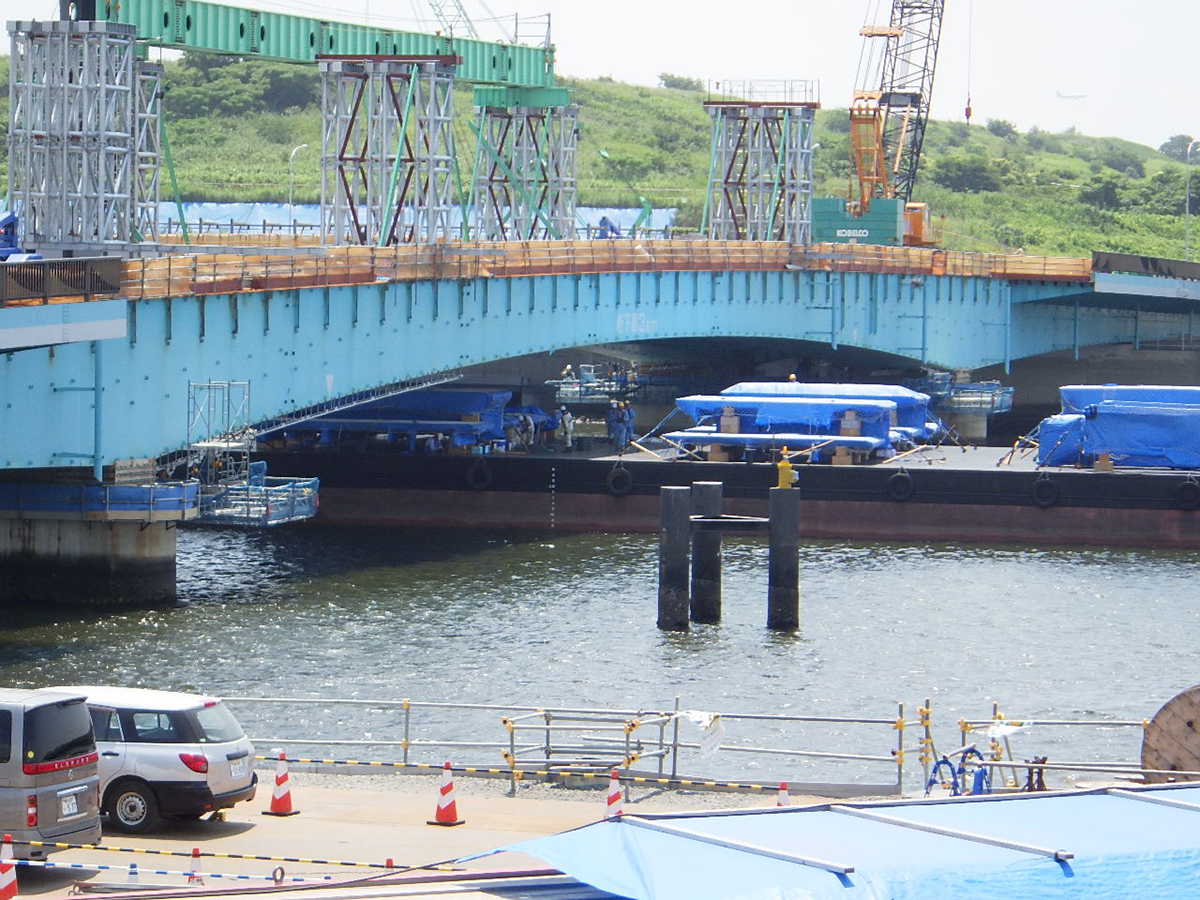 潮の干満がなくなる満潮時に、エンドレスローラーを駆動させ主桁移動を開始したが、台船上の主桁端部のぶれを抑えるのに苦労したという。また、陸上部のヤードの長さが40m程度と余裕がなく、桁長73mの主桁を引き出すためには細かな工程管理が必要になった。そこで、約36m陸上部に引き出した段階で、主桁先端部約15mを一度切断して、200t吊クローラークレーンで撤去を行った。先端部撤去後は主桁にカウンターウエイト30tを載せて、引き出した主桁の安定化を図っている。