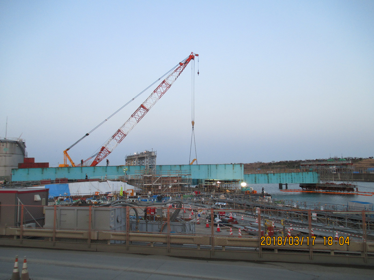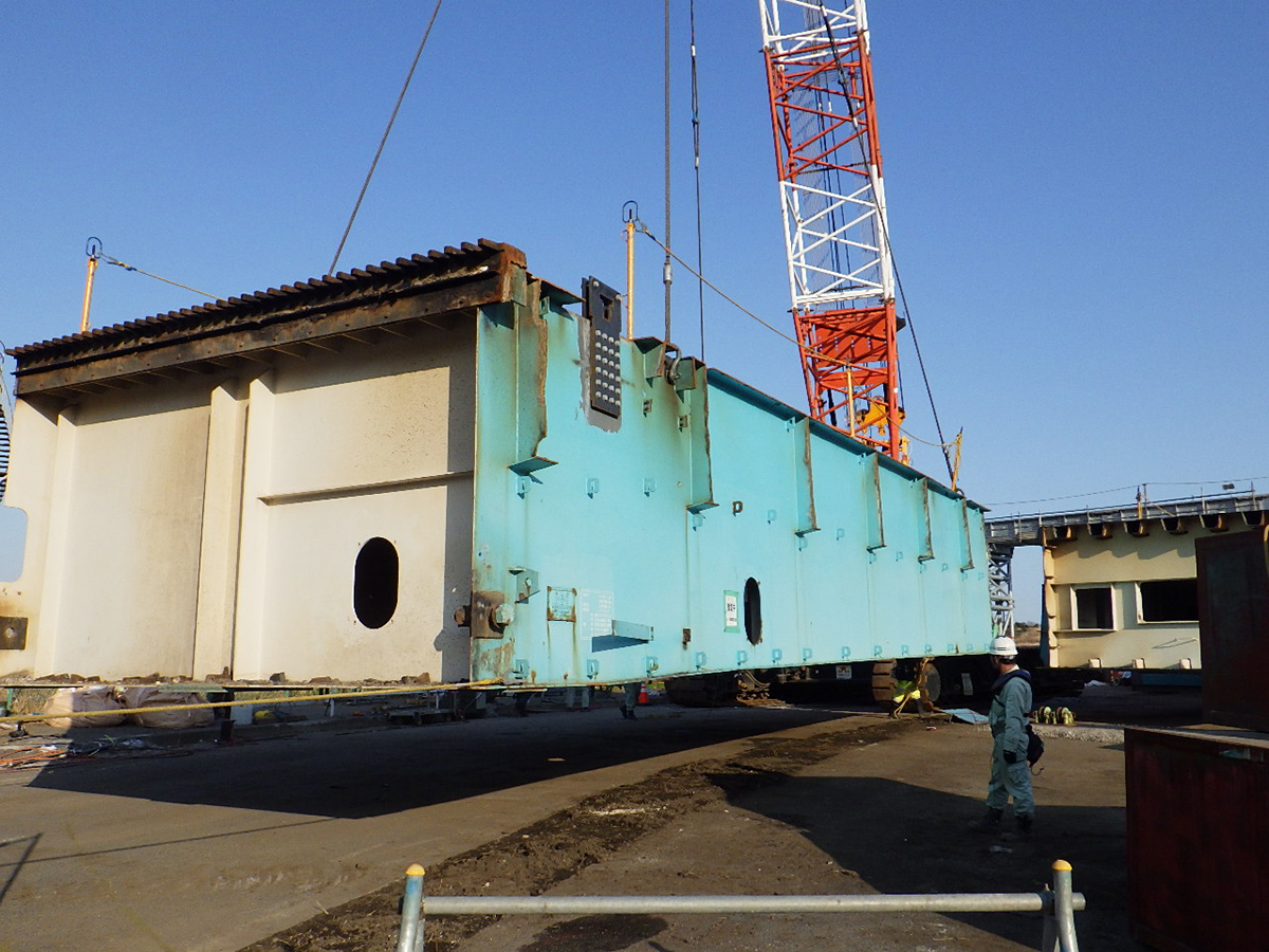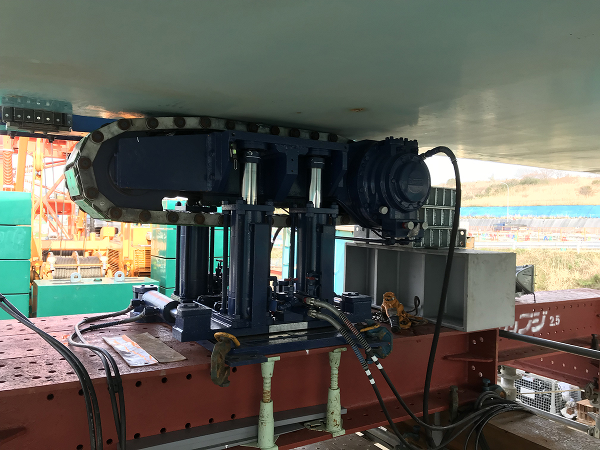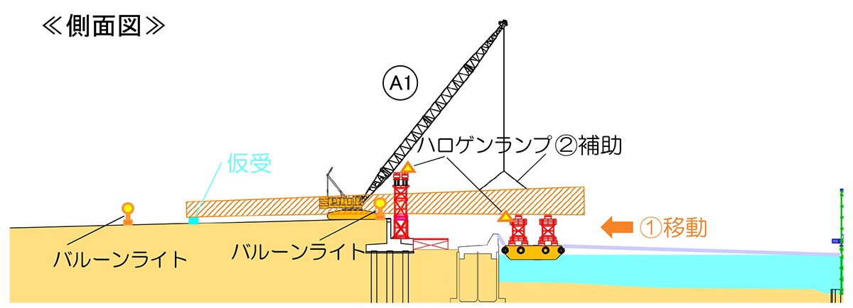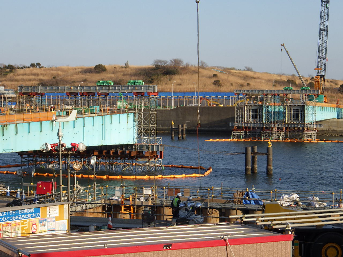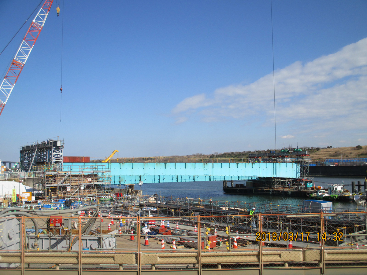 潮の干満がなくなる満潮時に、エンドレスローラーを駆動させ主桁移動を開始したが、台船上の主桁端部のぶれを抑えるのに苦労したという。また、陸上部のヤードの長さが40m程度と余裕がなく、桁長73mの主桁を引き出すためには細かな工程管理が必要になった。そこで、約36m陸上部に引き出した段階で、主桁先端部約15mを一度切断して、200t吊クローラークレーンで撤去を行った。先端部撤去後は主桁にカウンターウエイト30tを載せて、引き出した主桁の安定化を図っている。