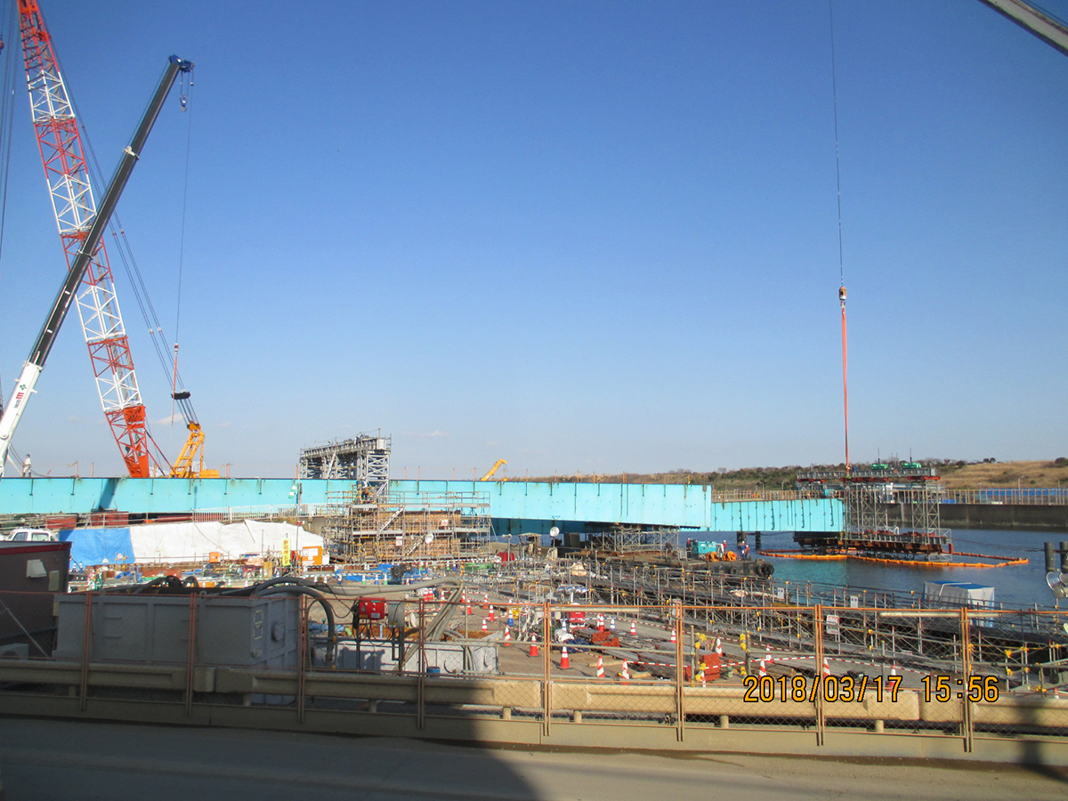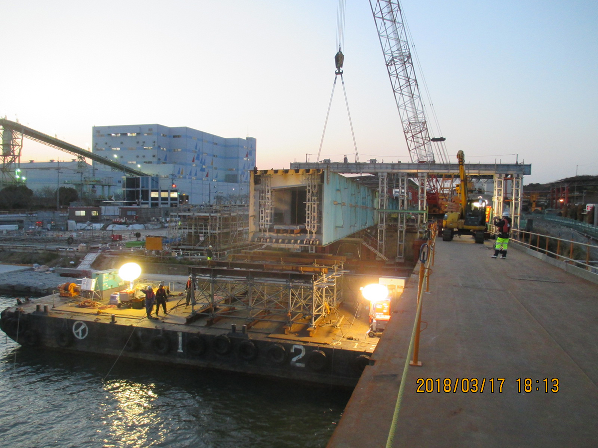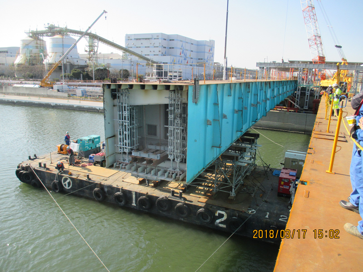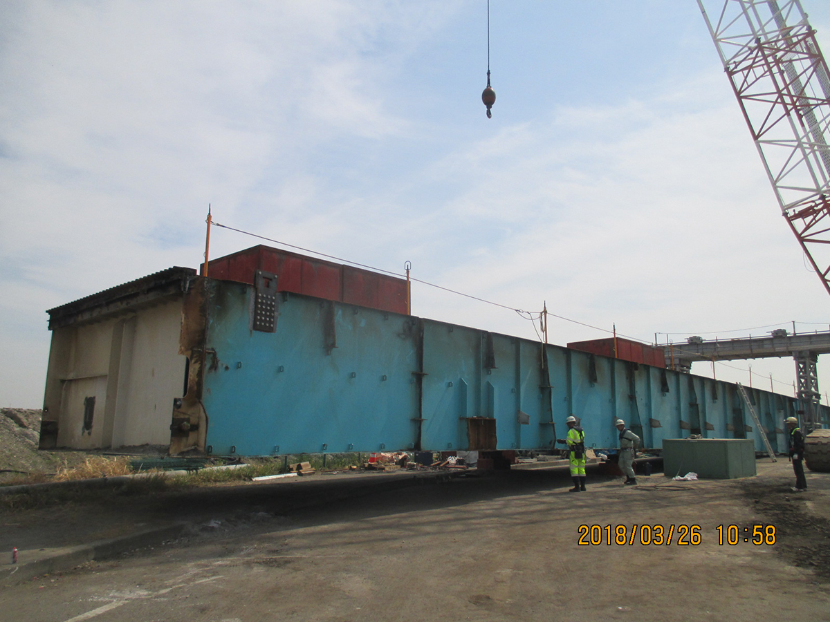 潮の干満がなくなる満潮時に、エンドレスローラーを駆動させ主桁移動を開始したが、台船上の主桁端部のぶれを抑えるのに苦労したという。また、陸上部のヤードの長さが40m程度と余裕がなく、桁長73mの主桁を引き出すためには細かな工程管理が必要になった。そこで、約36m陸上部に引き出した段階で、主桁先端部約15mを一度切断して、200t吊クローラークレーンで撤去を行った。先端部撤去後は主桁にカウンターウエイト30tを載せて、引き出した主桁の安定化を図っている。