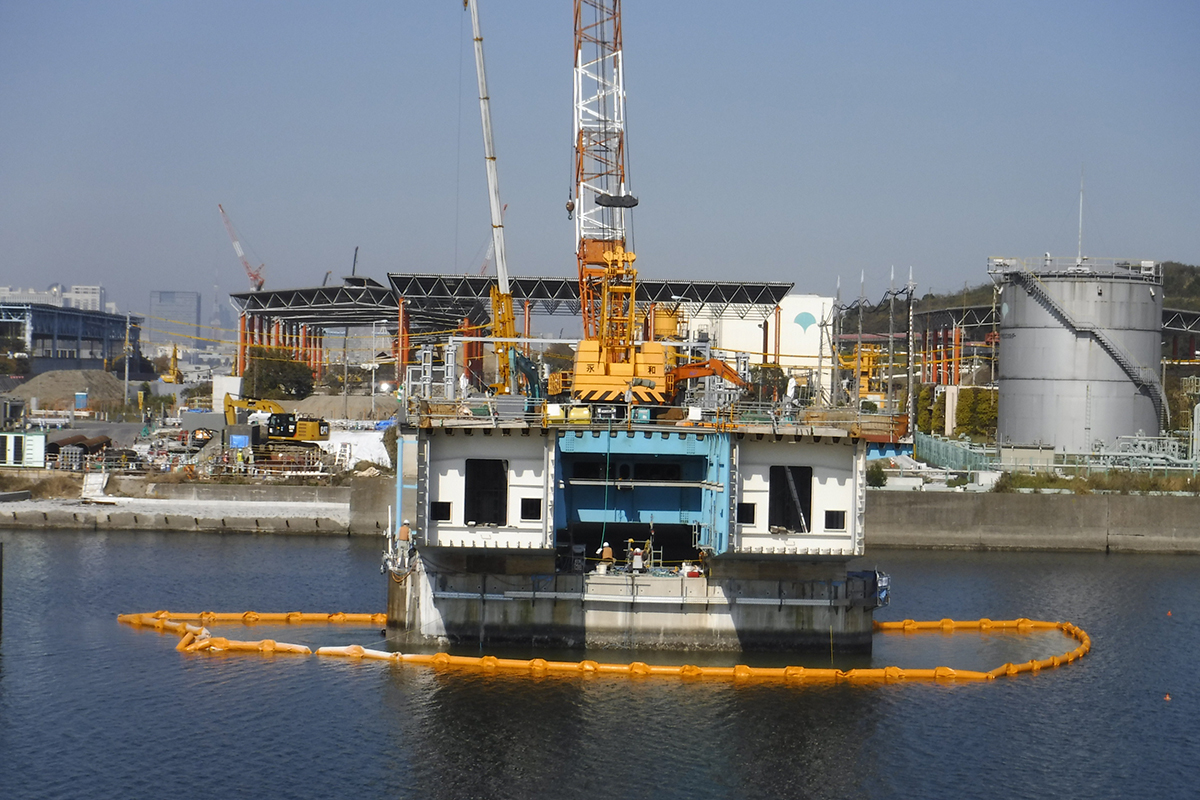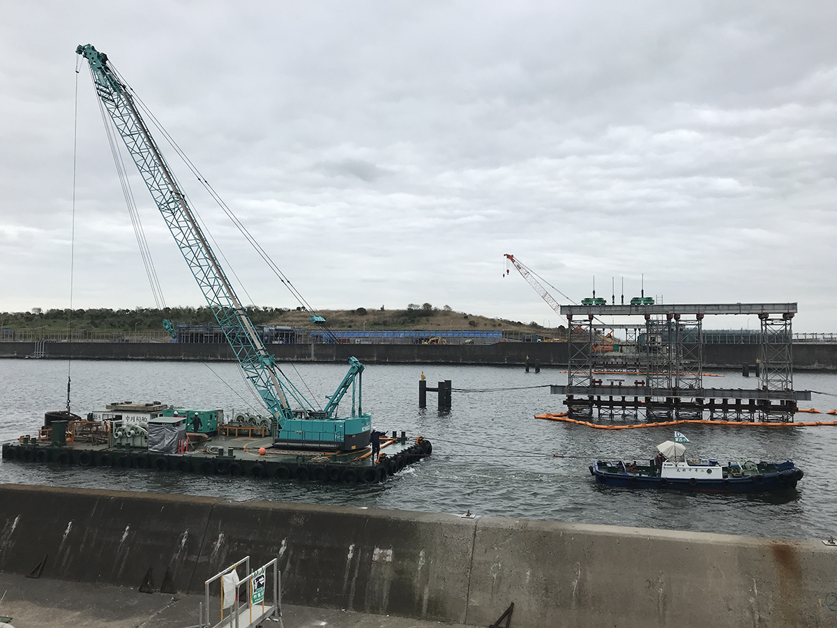 現場環境では、「東京オリンピック・パラリンピックの海の森水上競技場の工事エリア内であったために他工事との調整や、海上での作業で風が強かったこと、陸上部の限られたヤードなどにより、施工の安全確保が大きな課題だった」(エム・テック)という。