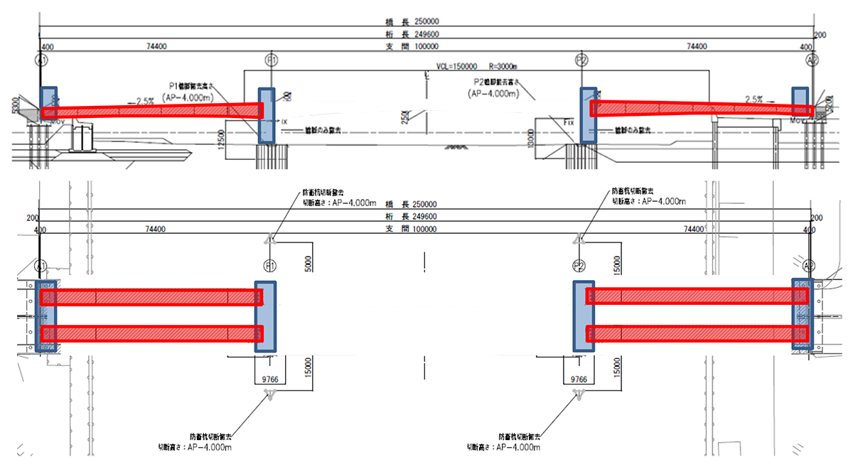 橋脚(P1・P2)の撤去は汚濁防止膜を設置して環境対策を行った後、まずは支承部に絡まない橋脚部をワイヤーソーで切断。切断は、橋脚R部両側と中央部に3分割、鉛直方向に2分割と合計6分割としている。