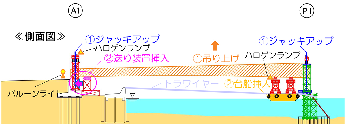 北径間の撤去では、P1とA1側に門構を設置して、横行レール上にセットしたセンターホールジャッキで、P1側は台船が、A1側は橋台上の両脇に2台設置したエンドレスローラーが挿入できる高さまで主桁を吊上げた。干潮時に300t積台船の挿入を行い、潮の満ちていくタイミングに合わせて主桁を降下して、台船上のベントとエンドレスローラーへの受換えを行った。