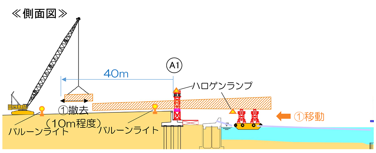 側径間の主桁撤去は、台船併用の引き出し工法で行った。中央径間の主桁撤去で用いた撤去用梁材での施工では、カウンターウエイトなどの反力管理が難しく、また2本目の主桁撤去への段取り替えにも時間がかかるうえに、陸上部のヤードが狭く工程調整が困難なため、工程を重視して採用した。工程は、主桁吊上げ、台船とエンドレスローラー(送り装置)挿入、主桁降下、主桁移動となっており、北径間西側、南径間東側、北径間東側、南径間西側の順番で撤去していった。