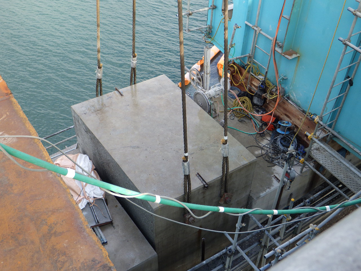 側径間の盛替では、海中ベントを設置しているが、基礎が十分な強度を保持しているかを確認するために、基礎からテストピースを採取して圧縮強度試験を実施して安全性を確認している。側径間の鋼材重量が600tで、橋上にクレーンを載せ、約60tの橋脚ブロックの吊上げ、旋回作業をすることになるので、設計段階でベントの荷重、応力、耐力の確認を行ったが、その照査にも非常に苦労している。盛替前には油圧ジャッキで側径間の荷重と同程度の圧力をベントの8箇所にかけて検証を行っている。さらに、底部が斜めになっている箱桁とベント上のH鋼に均等に荷重を伝達するために、硬木を加工して面受けできるようにして、盛替を完了させた。その後、支承部を切り離し、撤去を行った。