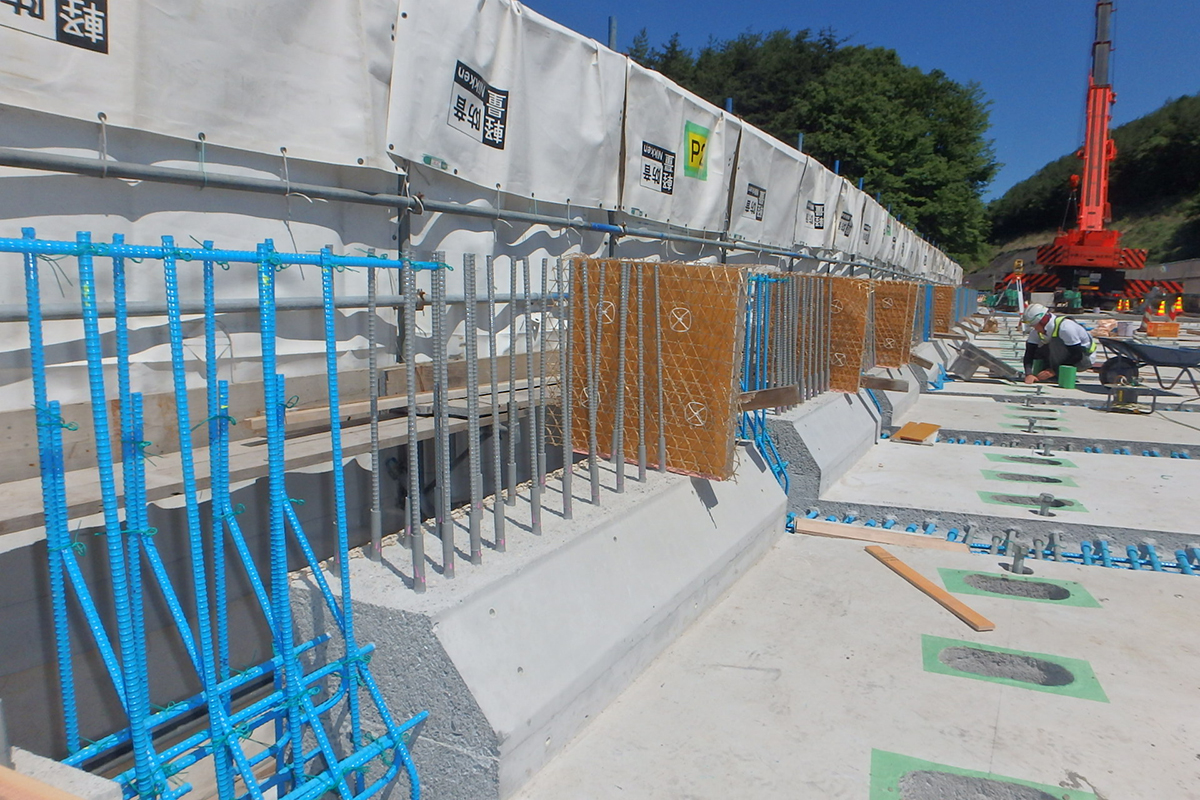 エンドバンド継手を採用(井手迫瑞樹撮影)/壁高欄鉄筋の組み立て(中日本高速道路提供)