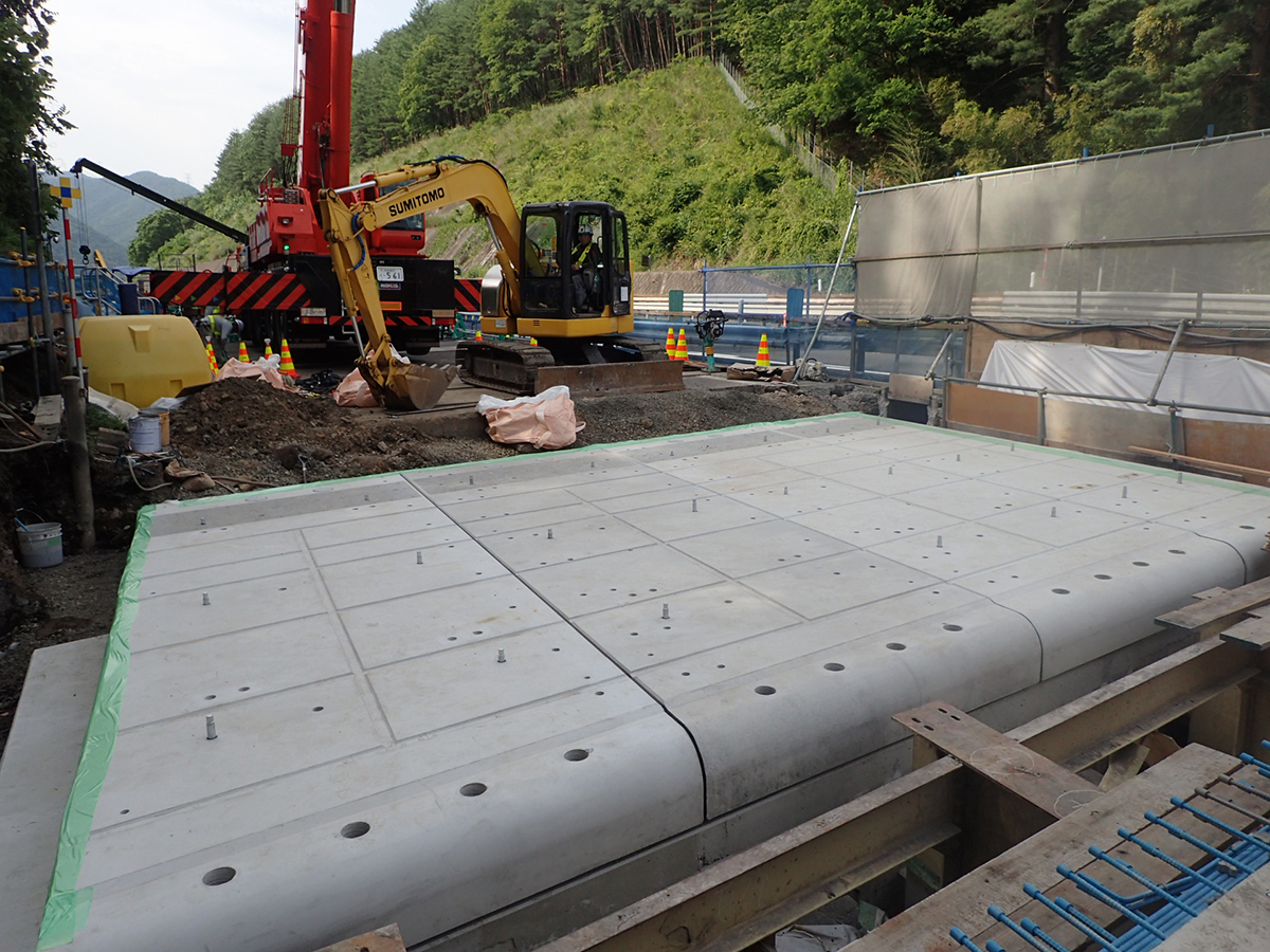 本工事ではプレキャストPC床版にSLJスラブを採用した。継手はエンドバンド継手を採用しており、従来のループ継手と比較して間詰め部を短く、かつ薄くできるため、床版全体の厚さおよび重量を抑制できる。間詰め部のコンクリートは耐久性を考慮して高炉スラグ微粉末入りのコンクリート(50%置換)を採用している。なお、床版の鉄筋および継手部のエンドバンド鉄筋および橋軸直角方向の鉄筋はエポキシ樹脂塗装鉄筋を採用している。高欄は現場打ち施工を採用、ここでもエポキシ樹脂塗装鉄筋を用いている。